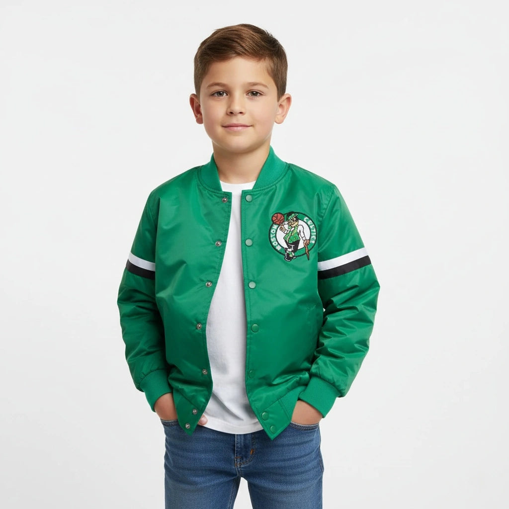 Let your young fan show off their Celtics pride with the Boston Celtics Kids Green Satin Varsity Jacket — a perfect blend of team spirit and classic varsity style!