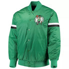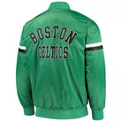 Made from smooth green satin, this jacket features full-snap button closure and bold embroidered Boston Celtics logos on the chest and back. The rib-knit collar, cuffs, and hem add timeless letterman detailing, while the lightweight quilted lining provides just the right amount of warmth for year-round wear.