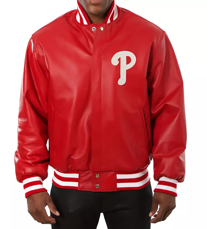 Men Philadelphia Phillies Letterman Varsity Jacket Red Genuine Leather Jacket - MLB