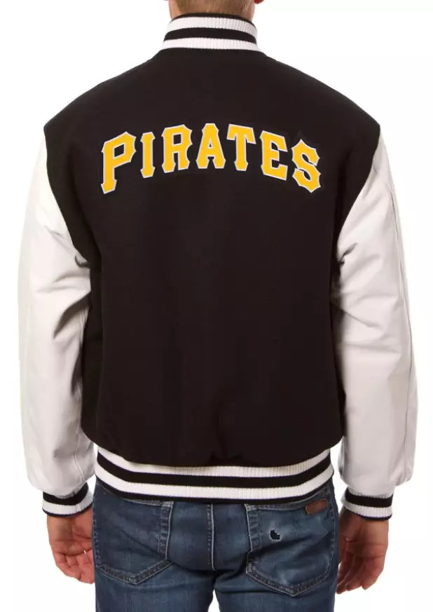 Men Pittsburgh Pirates Letterman Varsity Jacket with Leather Sleeves - Black & White - MLB