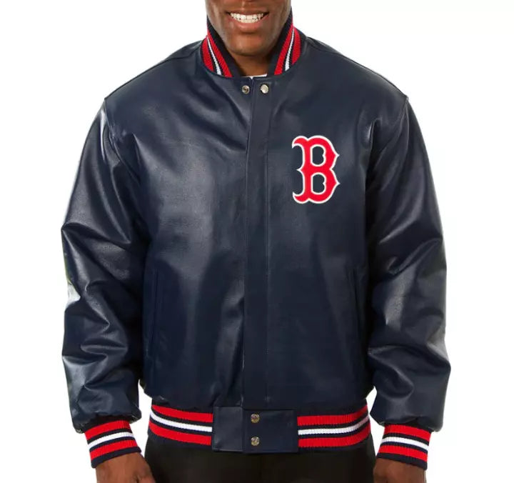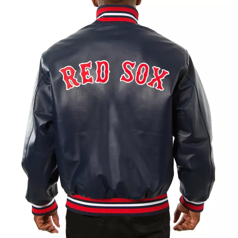 how your Boston Red Sox pride with this Men’s Black Letterman Varsity Jacket, featuring genuine leather construction and bold team logos. The sleek black leather design combines luxury with durability, while the embroidered Red Sox logos add authenticity and showcase your team spirit. Perfect for fans looking for a stylish way to support their team, this jacket is a standout piece.