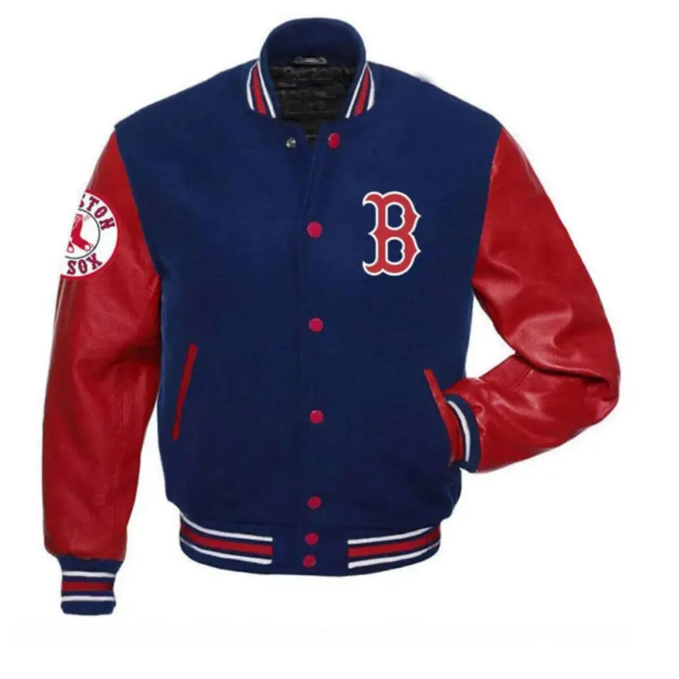 Show your Boston Red Sox pride with this Men’s Red and Blue Letterman Varsity Jacket, featuring genuine leather sleeves. The vibrant red wool body paired with blue leather sleeves creates a striking look that blends classic varsity style with a modern touch. The iconic Red Sox logo on the chest adds authenticity, making it the perfect way to represent your team.