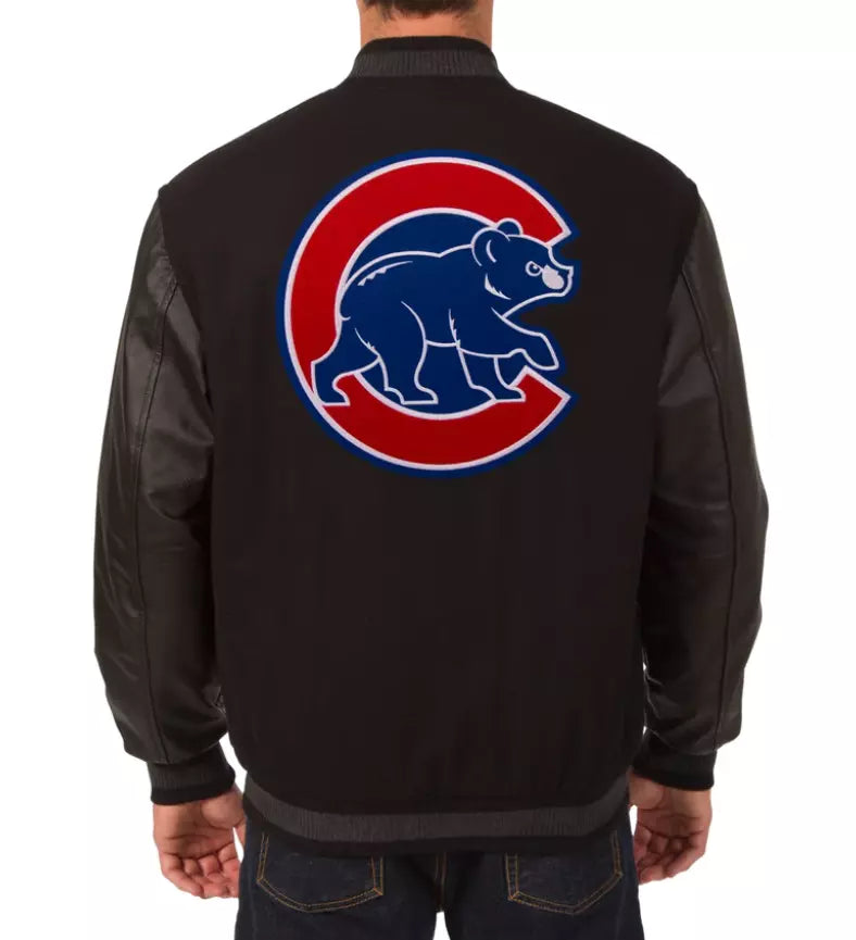 Show your Chicago Cubs pride in this Men’s Black Letterman Varsity Jacket, featuring black wool and genuine leather sleeves. This jacket combines timeless varsity style with premium materials, offering a sleek and stylish way to support your team. The bold Cubs logo on the chest ensures you represent your team authentically, whether you're at a game or out for a casual day.
