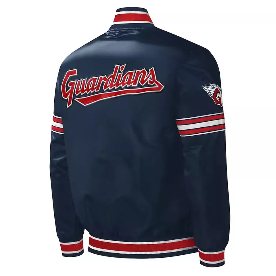 Support your team in style with this Cleveland Guardians Navy Satin Varsity Jacket. Designed with a classic letterman look, it combines modern comfort with iconic MLB vibes, perfect for game days or streetwear fashion.