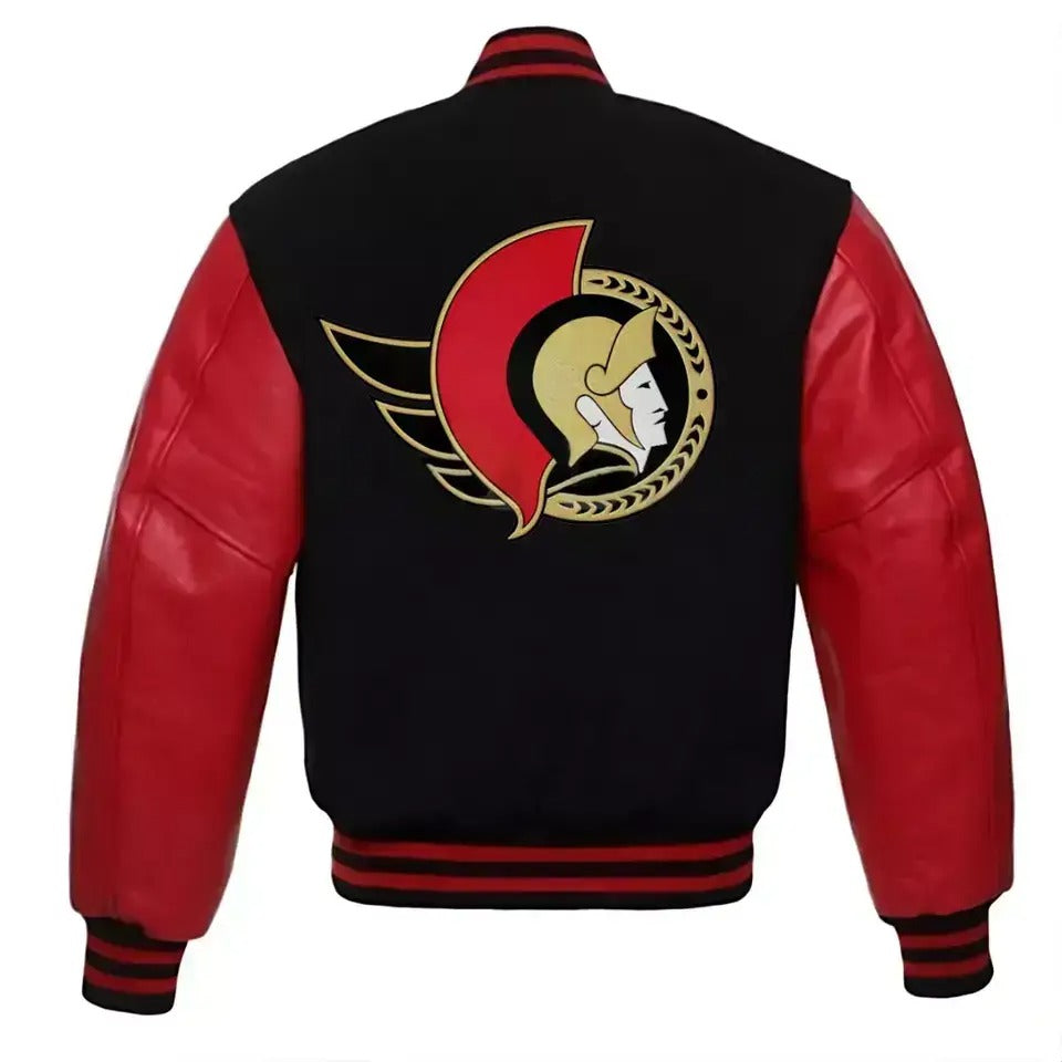 Men Letterman Ottawa Senators Black Varsity Jacket With Red Genuine Leather Sleeves - MLB
