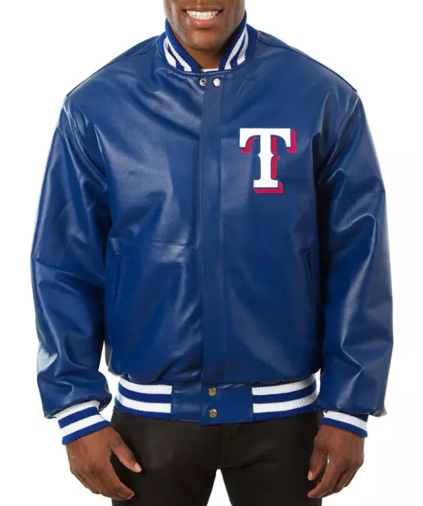 Represent the Texas Rangers in style with the Men’s Letterman Varsity Jacket made from genuine blue sheep leather. This jacket offers a sleek, premium look while showcasing the iconic Rangers logo on the chest. The genuine leather construction ensures both durability and comfort, making it perfect for game days or casual outings.