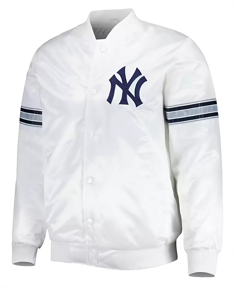 Support your New York Yankees in style with this Men’s White Satin Full-Snap Varsity Jacket. Featuring a sleek satin finish, this jacket combines classic varsity style with a modern twist. The full-snap closure ensures easy wear, while the iconic Yankees logo on the chest adds an authentic fan touch, making it the perfect piece to represent your team.