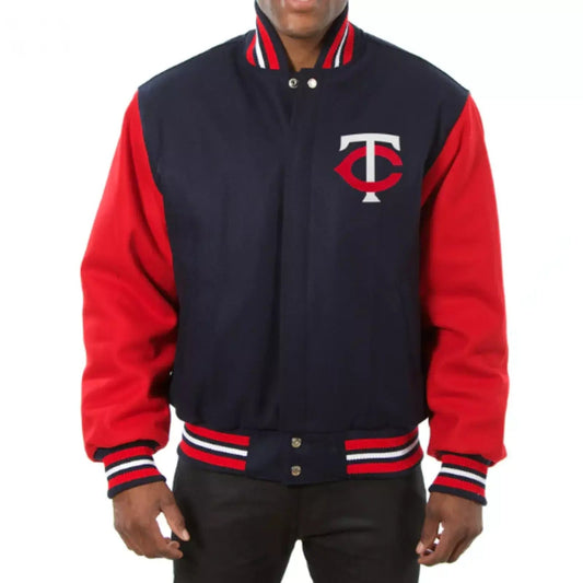 Support your Minnesota Twins with this Men’s Letterman Navy Wool Varsity Jacket, featuring embroidered logo...