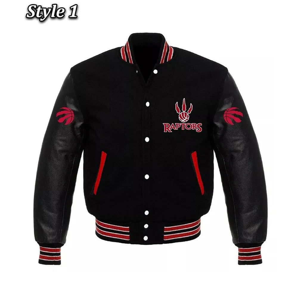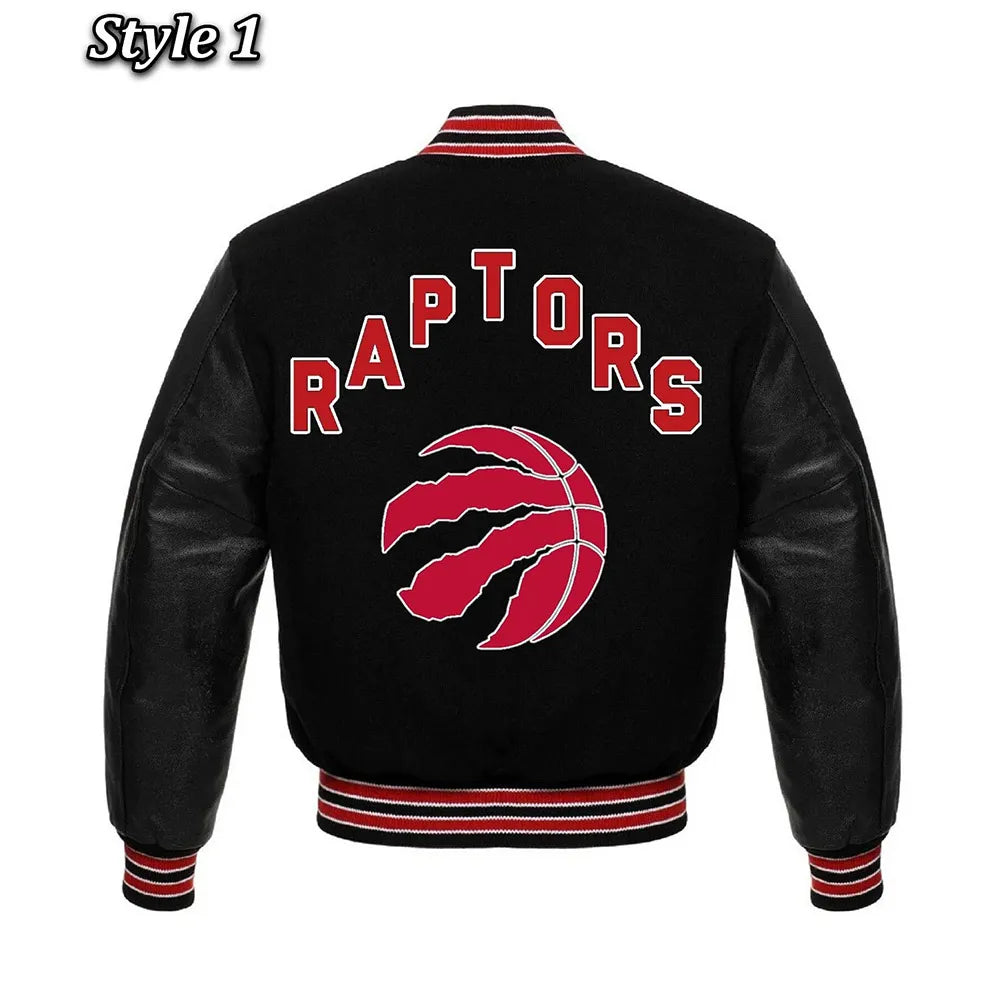 • Bold black varsity jacket with Toronto Raptors championship theme