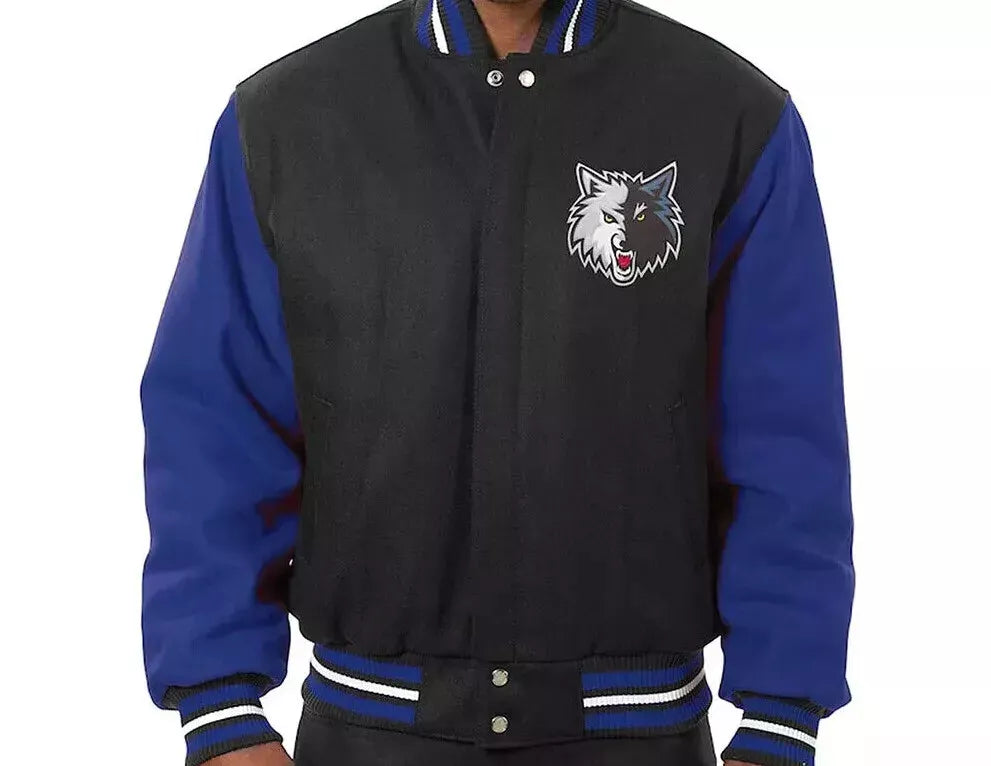 Rep your team with the Minnesota Timberwolves Black and Royal Blue All Wool Varsity Jacket. This high-quality wool jacket combines comfort with style, making it the perfect addition to any NBA fan's wardrobe.