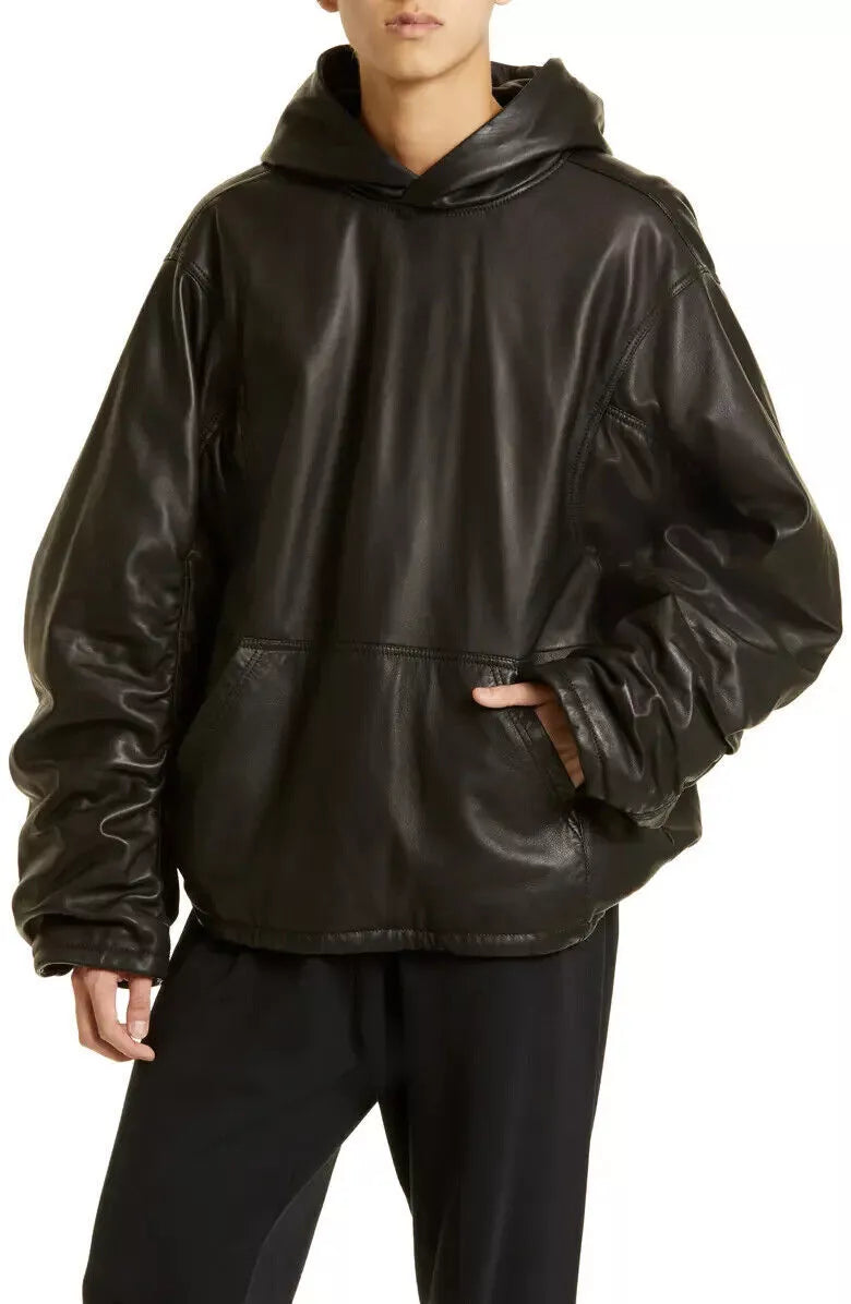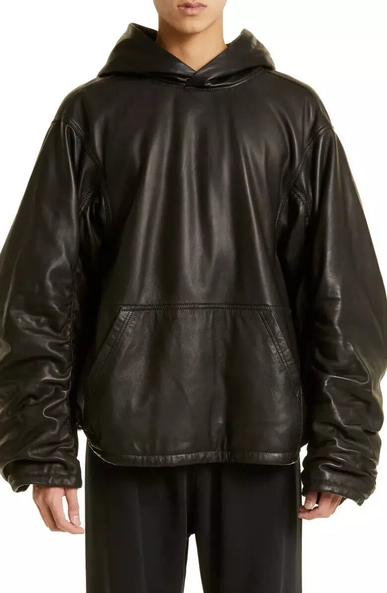 Men Black Oversized Casual Hoodie Leather Jacket Kangaroo Pocket Soft Coat.