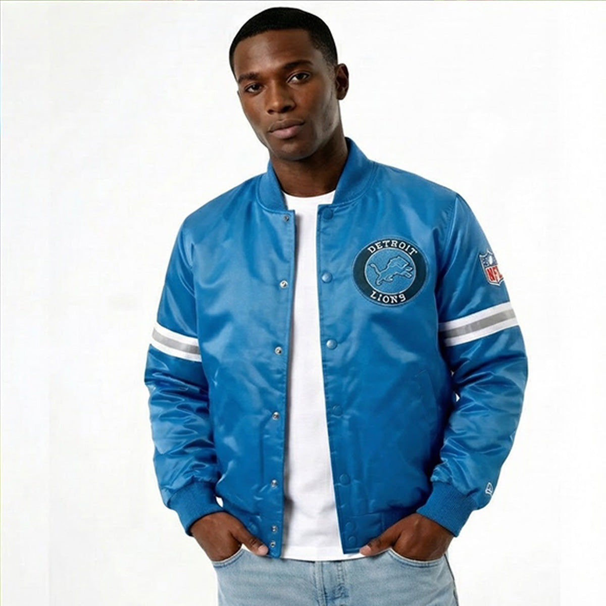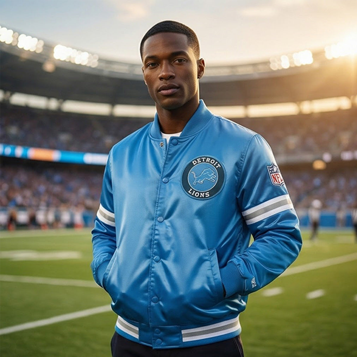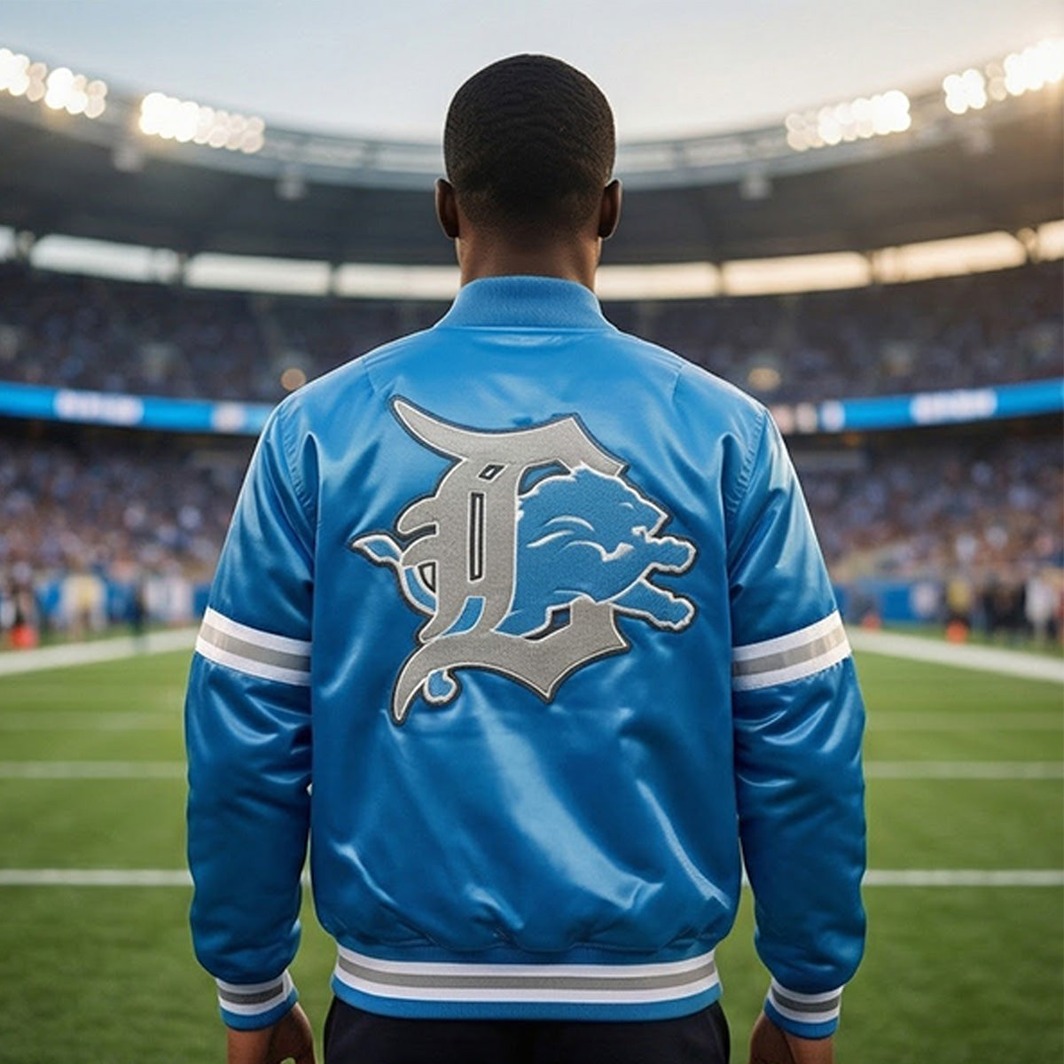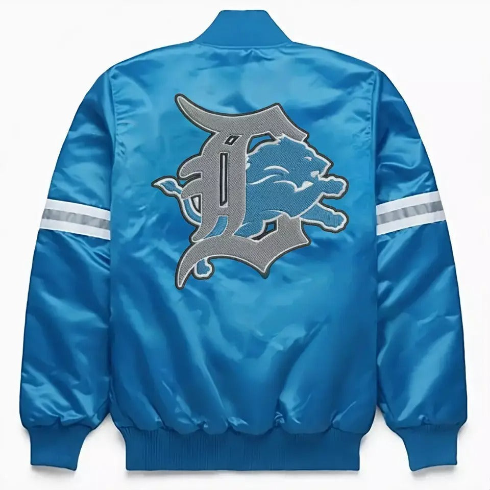 Celebrate your Detroit Lions pride with this premium sky blue satin varsity jacket. Designed for true fans who demand both style and authenticity, this letterman jacket combines classic varsity heritage with bold team spirit.