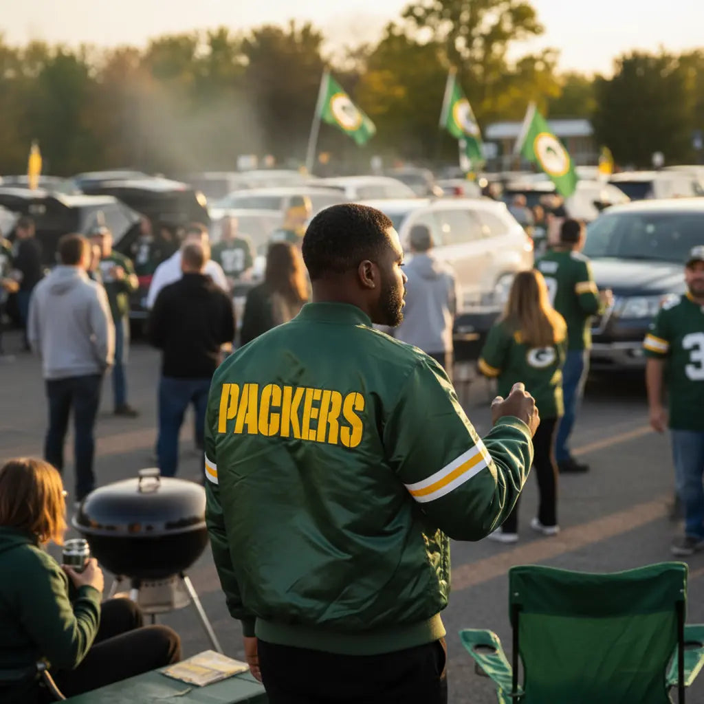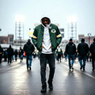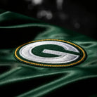 Show your Packers pride with this bold Green Bay Packers letterman varsity jacket. The striking green satin body combined with the genuine leather sleeves creates a stylish and durable look. The embroidered Packers logo adds authenticity, while the ribbed collar, cuffs, and waistband offer a snug, comfortable fit. Perfect for game days or casual outings, this jacket lets you display your team spirit in ultimate style."