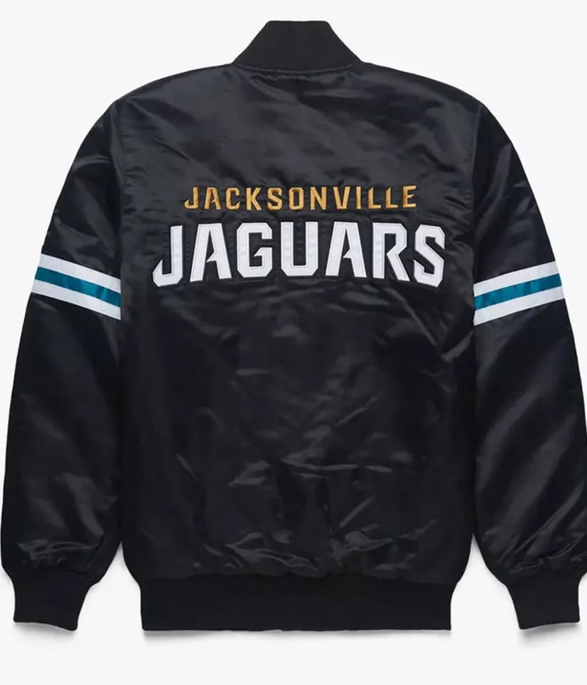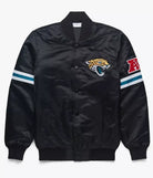 Make a bold statement with this premium Jacksonville Jaguars Black Satin Varsity Bomber Jacket. Crafted from luxurious satin with authentic embroidered team logos, this jacket delivers the perfect blend of heritage varsity style and modern NFL fandom.
