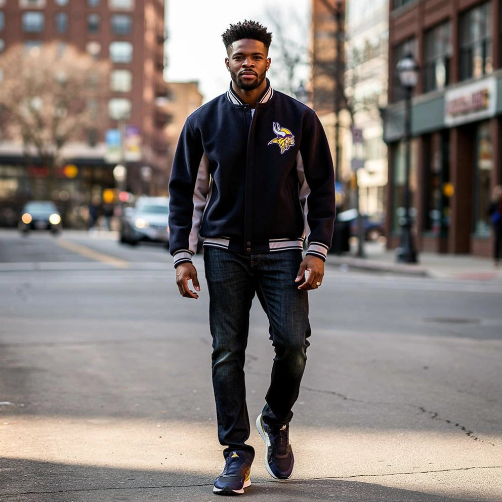 This isn't just another fan jacket, it's a statement piece that bridges vintage sportswear aesthetics with modern NFL fandom. Whether you're heading to U.S. Bank Stadium, watching the game with friends, or adding to your Vikings collection, this varsity jacket delivers authentic style and uncompromising quality.