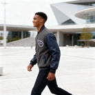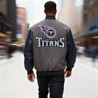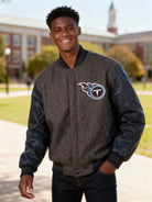 Step into the stadium or the street with authentic Titans pride. This premium charcoal and navy varsity jacket combines classic letterman styling with official NFL branding, making it the ultimate piece for die-hard fans who demand both heritage and performance.
