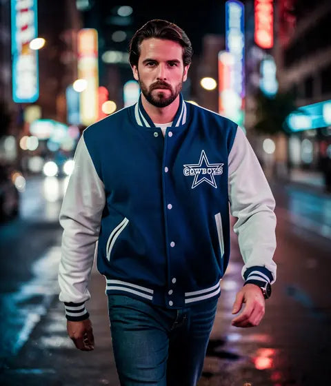 Whether you're heading to AT&T Stadium, watching the game with friends, or adding a statement piece to your everyday wardrobe, this varsity jacket delivers unmatched style and comfort. The classic fit works for layering over hoodies or wearing solo.