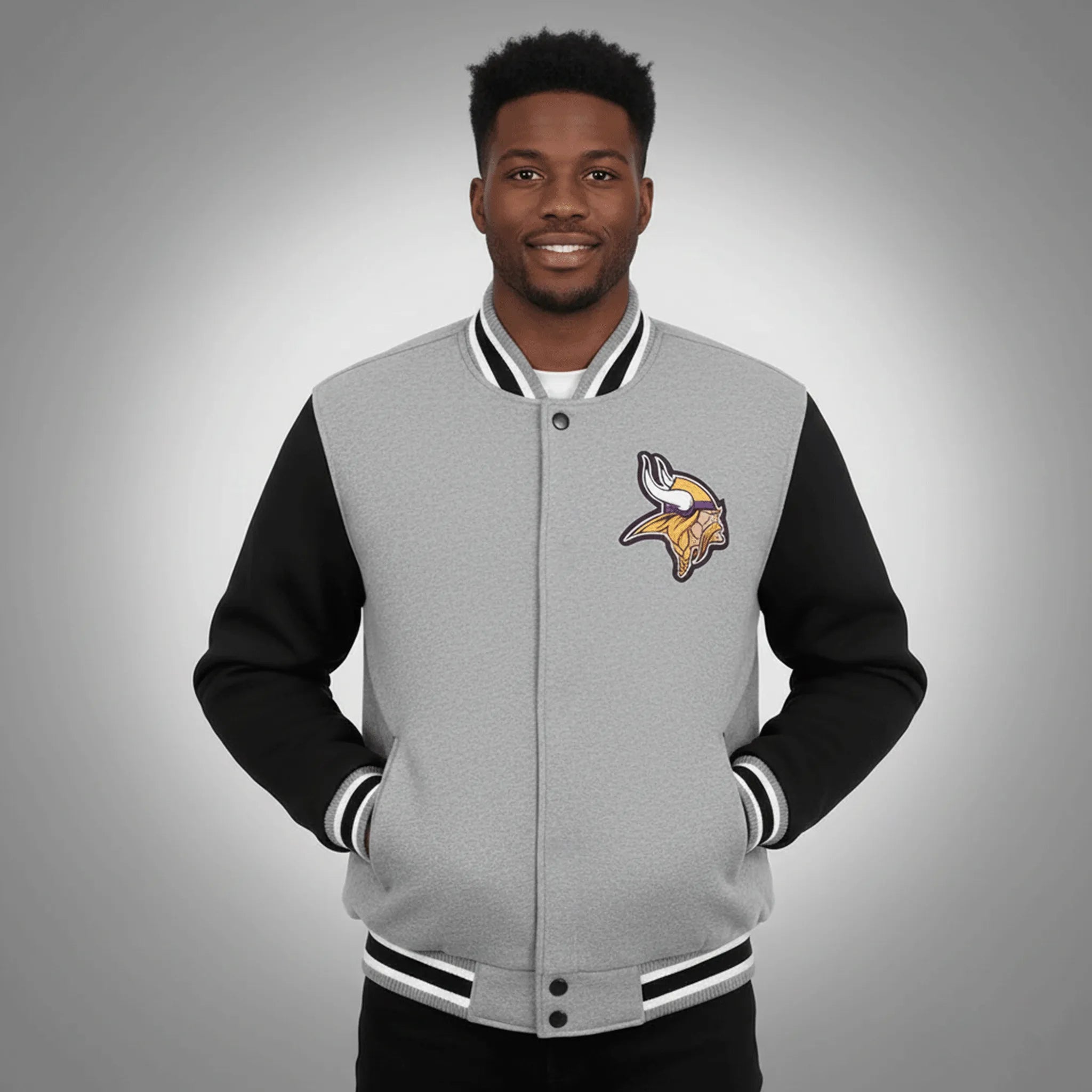 Step into the stadium or your favorite sports bar with authentic Vikings pride. This premium varsity jacket combines classic letterman styling with official NFL team details, making it the ultimate statement piece for any Minnesota Vikings fan.