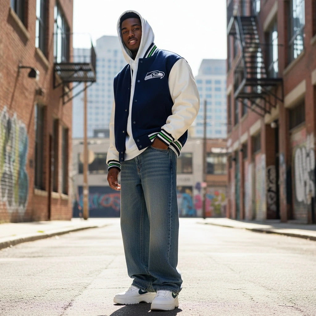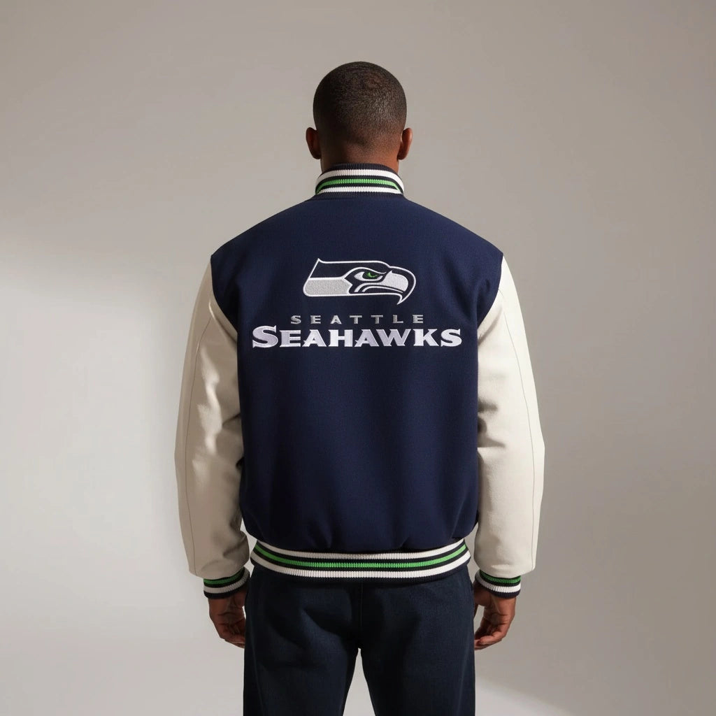 Whether you're cheering from the stands at Lumen Field, watching the game with friends, or adding a statement piece to your casual wardrobe, this varsity jacket delivers authentic team spirit with timeless style.