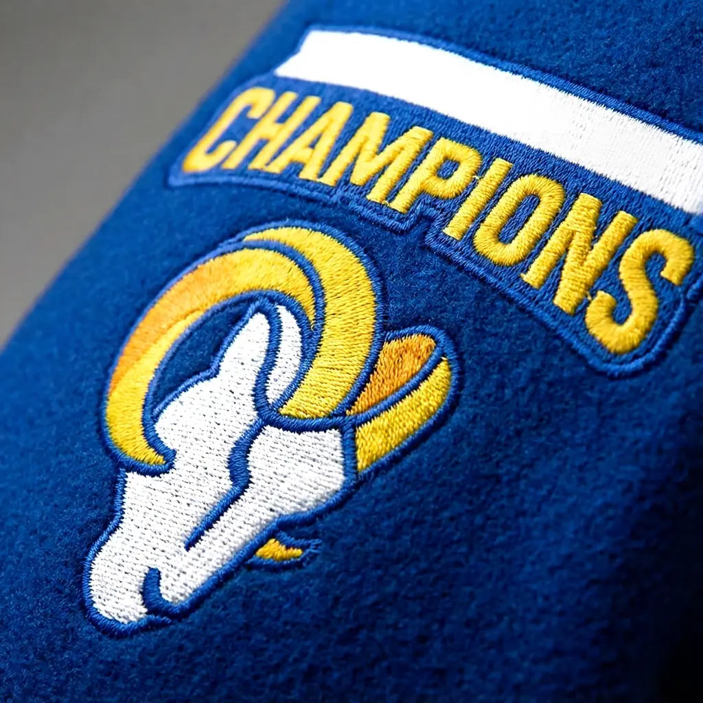 Whether you're heading to the stadium, watching the game with friends, or just showing your Rams pride around town, this varsity jacket delivers authentic style and unbeatable comfort. It's the perfect way to commemorate one of the greatest moments in LA sports history.