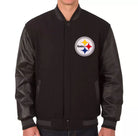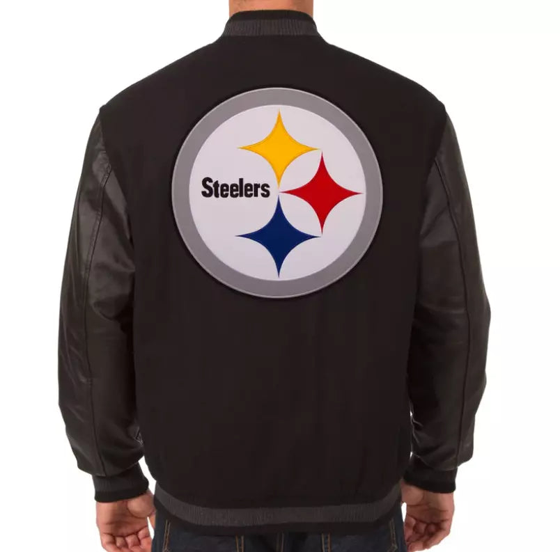 Display your Steelers pride in this sleek NFL Pittsburgh Steelers letterman varsity jacket. Featuring a bold black wool body paired with durable real leather sleeves, this jacket provides both style and comfort. The embroidered Steelers logo offers authenticity, while the ribbed collar, cuffs, and waistband provide a snug and secure fit. Perfect for game days, casual outings, or representing your team in ultimate comfort and style."
