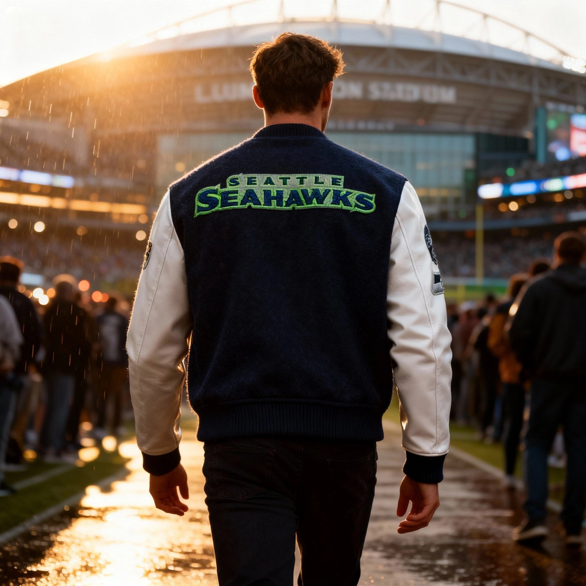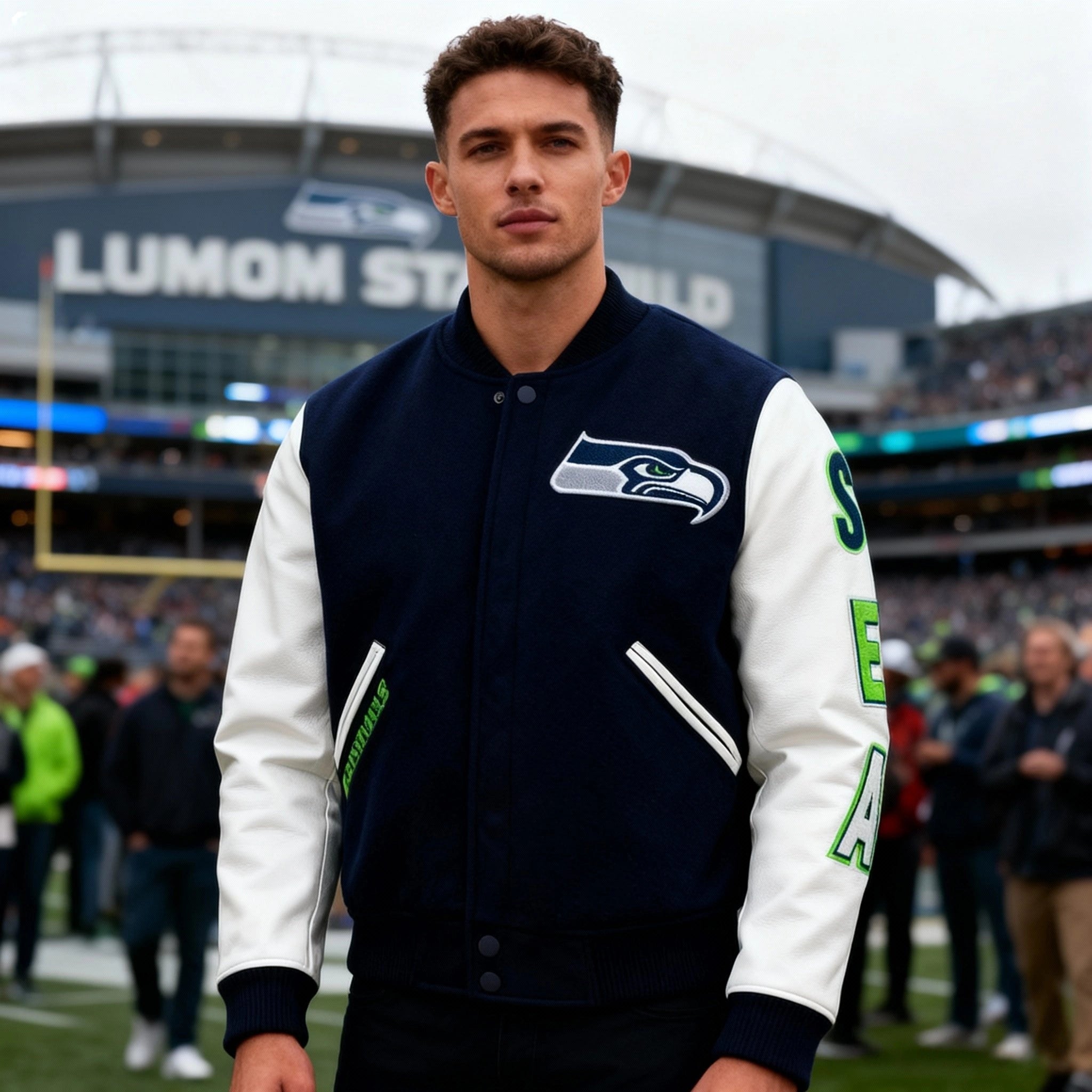 Show off your team pride with this stylish Seattle Seahawks letterman varsity jacket. Crafted with a navy wool body and white genuine leather sleeves, this jacket blends classic varsity style with premium materials. The embroidered Seahawks logo adds authenticity, while ribbed cuffs, collar, and waistband offer a snug, comfortable fit. Whether you’re at the stadium or out in the city, this jacket ensures you stand out as a true Seahawks fan."