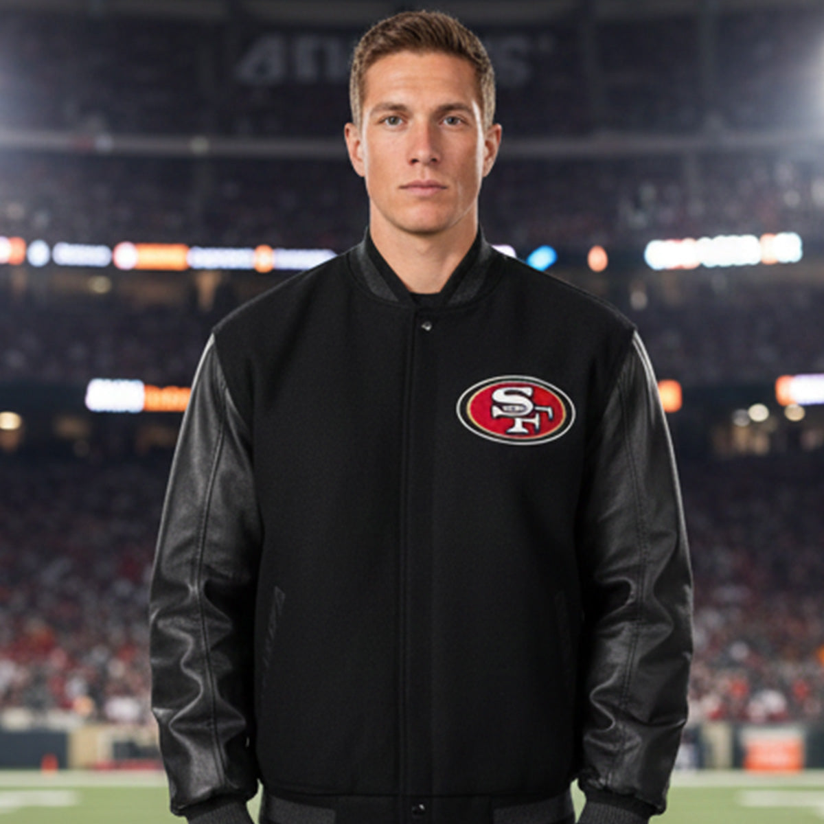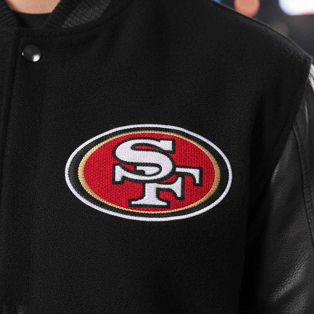 Show your San Francisco 49ers pride with this Black Letterman Varsity Jacket featuring genuine leather sleeves. The sleek black body pairs perfectly with the durable leather sleeves for a stylish, classic look. Embroidered 49ers logos add authenticity and team spirit, while ribbed cuffs, collar, and waistband ensure a snug, comfortable fit. Whether you're at the game, hanging out with friends, or adding to your collection, this jacket is a must-have for every 49ers fan."
