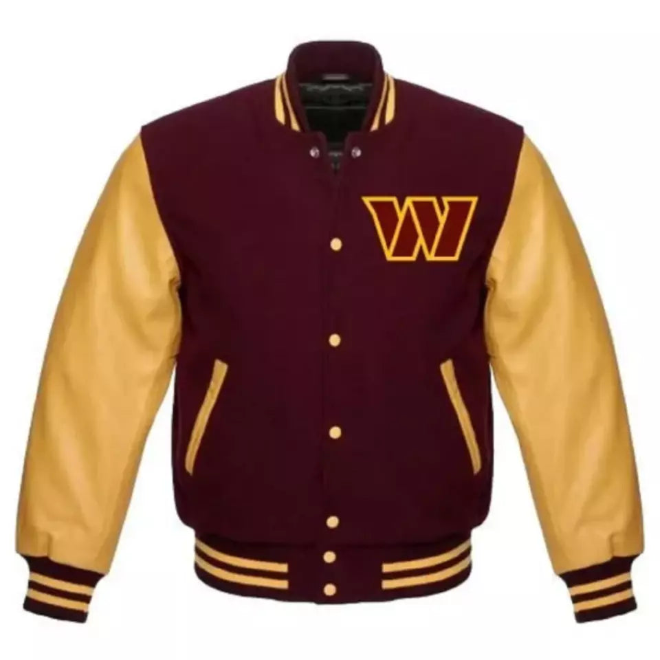Show your Washington Commanders pride with this Yellow and Burgundy Letterman Varsity Jacket. The bold combination of yellow and burgundy creates a striking design, while the embroidered Commanders logo adds authenticity. With ribbed cuffs, collar, and waistband, this jacket provides a comfortable fit, perfect for game days, casual outings, or as a collector’s item. Stay stylish and support your team with this must-have jacket for every true Commanders fan."