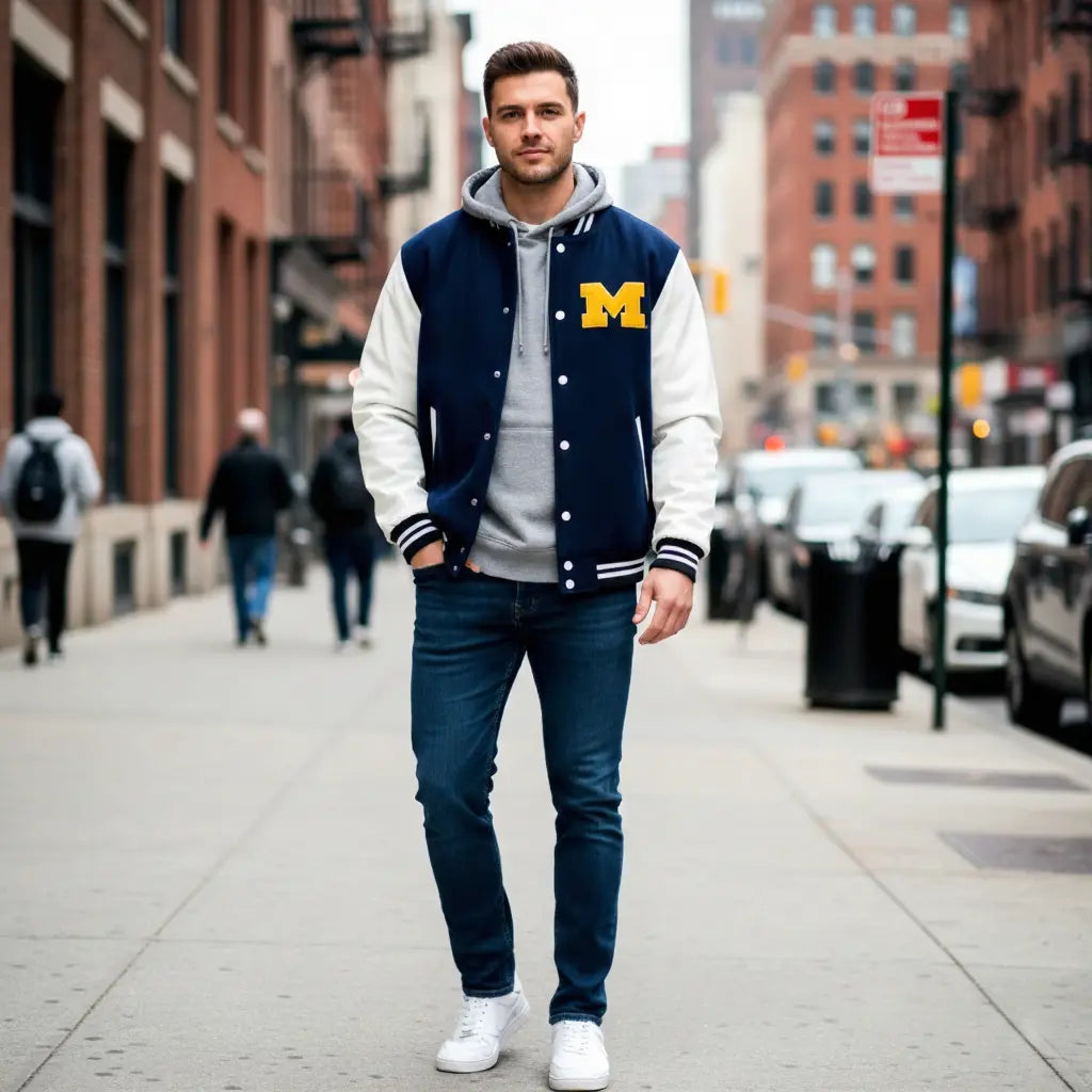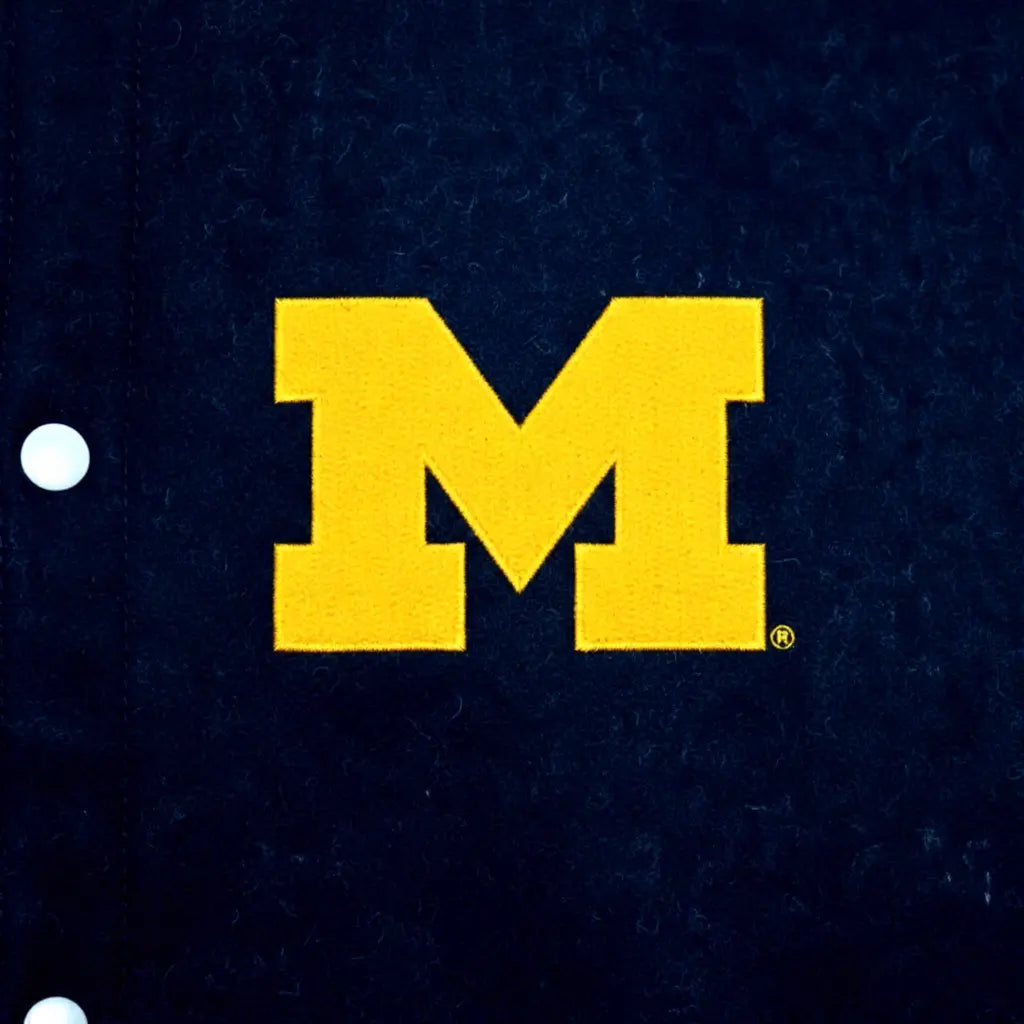 Michigan Wolverines Navy And White Wool Varsity Jacket With Real Leather Sleeves