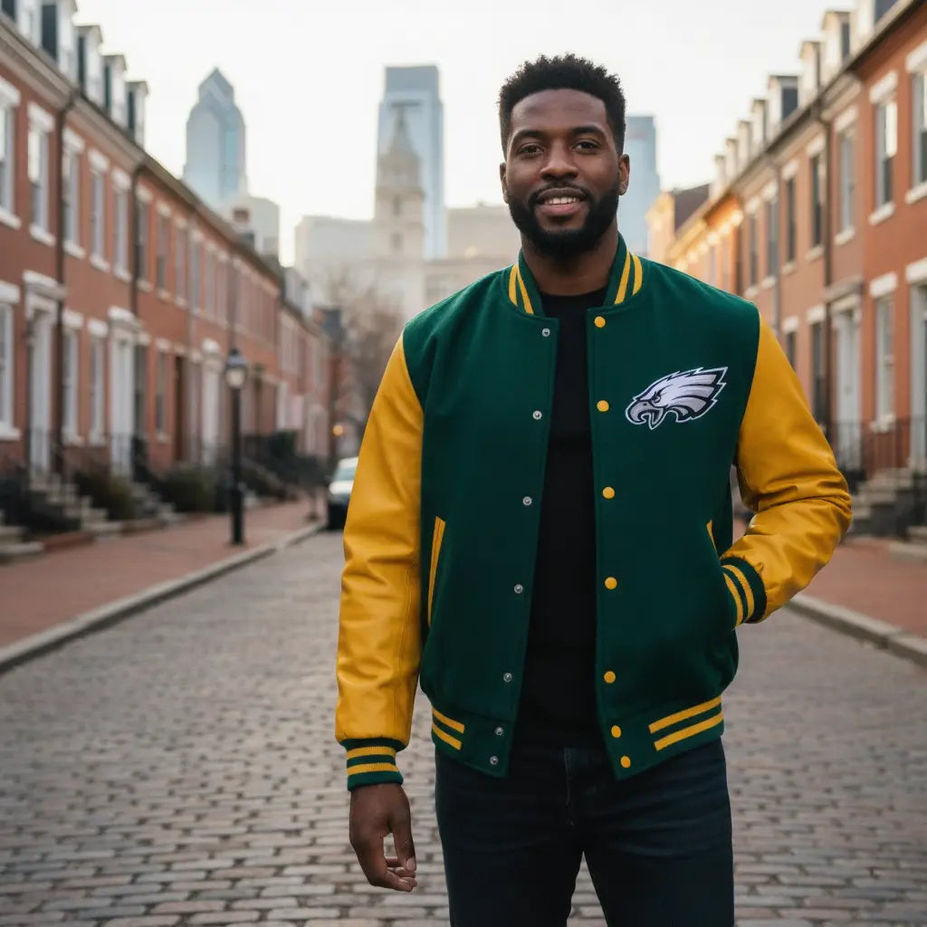 NFL - Philadelphia Eagles Green Wool Letterman Varsity Jacket With Real YELLOW Leather Sleeve