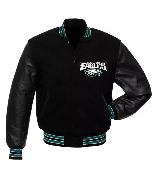 Rep your Philadelphia Eagles in style with this Black Letterman Varsity Jacket featuring genuine leather...