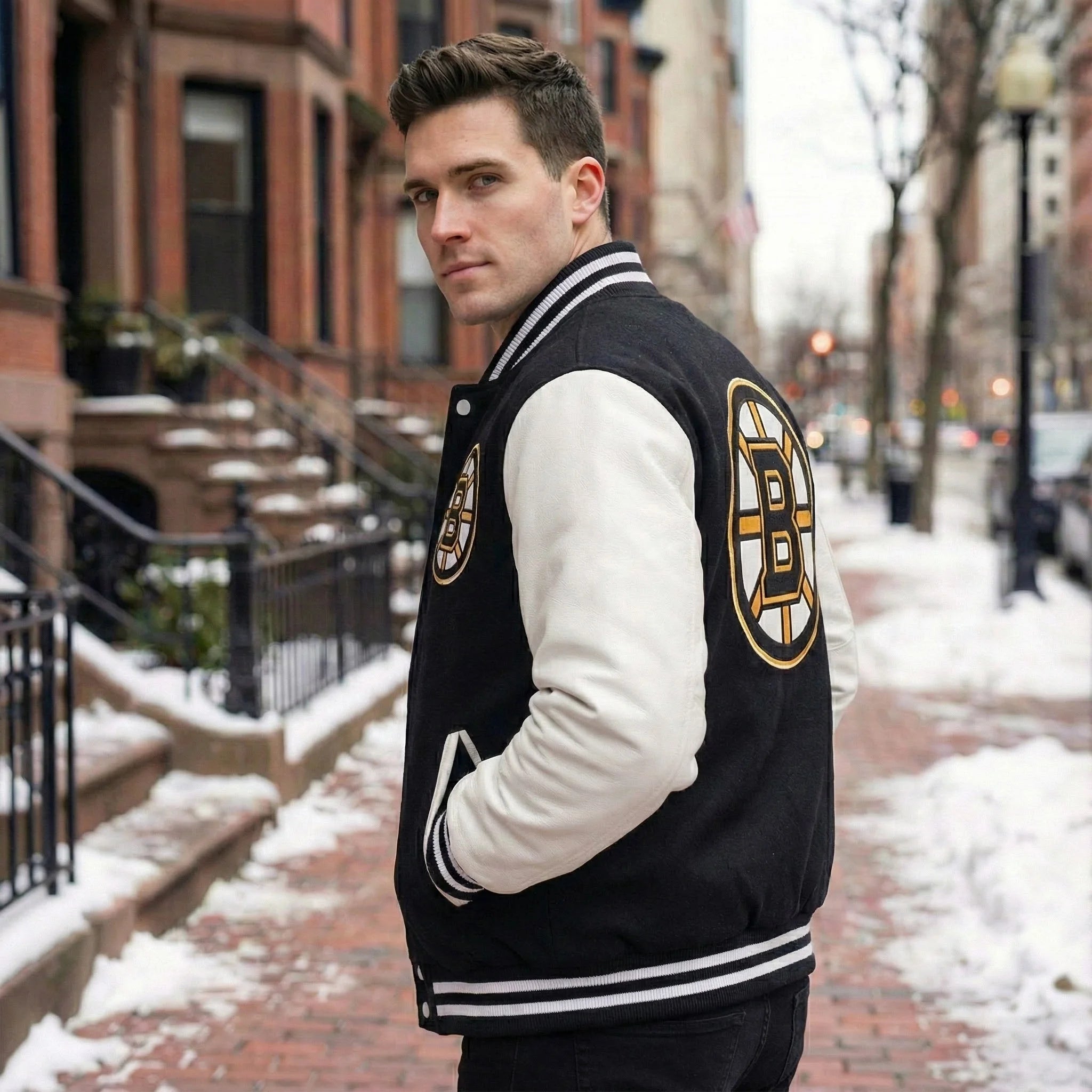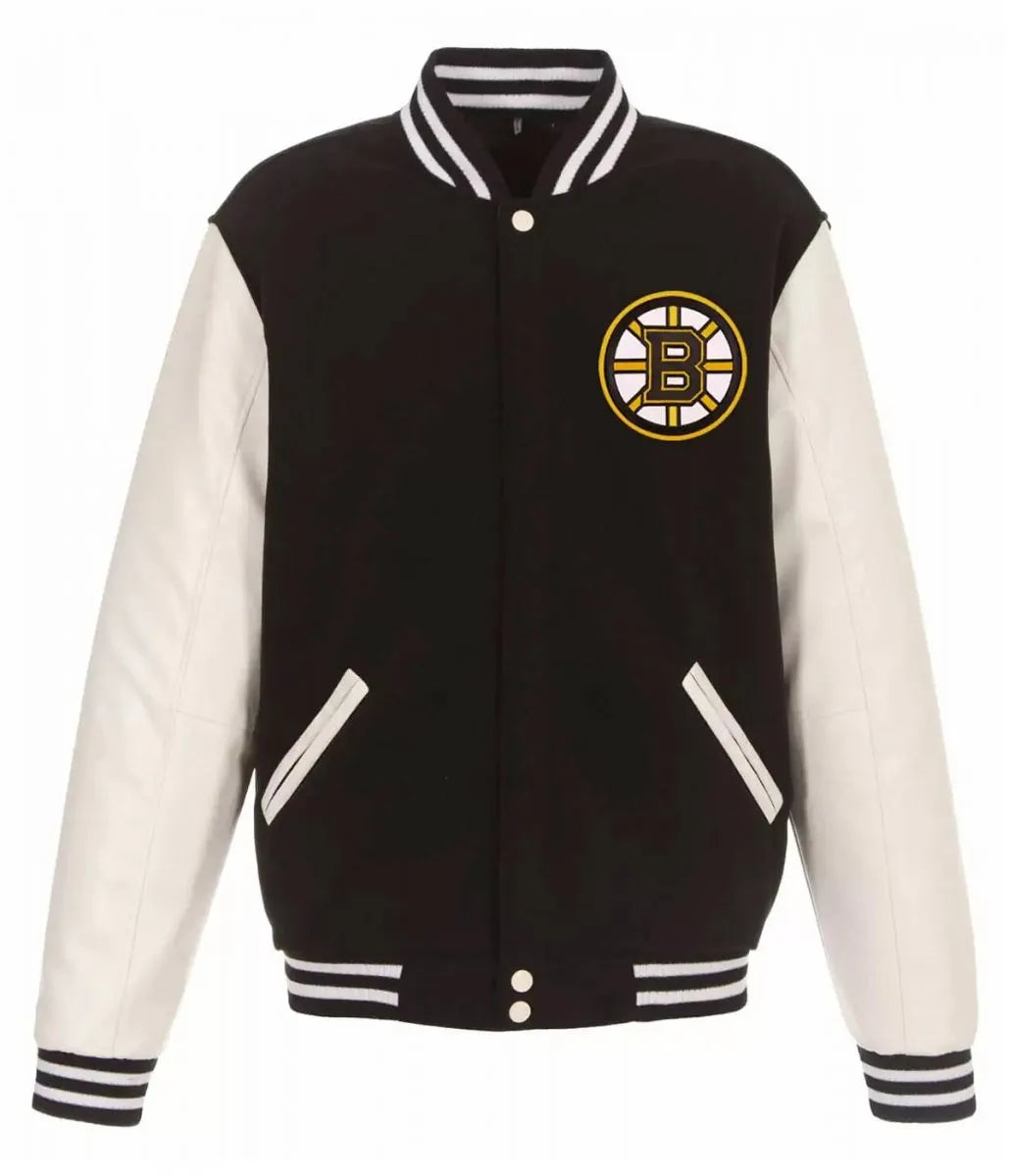 This isn't just a jacket—it's a statement of loyalty. Whether you're at TD Garden cheering on the Bruins or out with friends, this varsity jacket combines heritage-inspired design with premium craftsmanship. The contrast of crisp white wool and bold black leather creates a timeless look that never goes out of style.