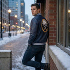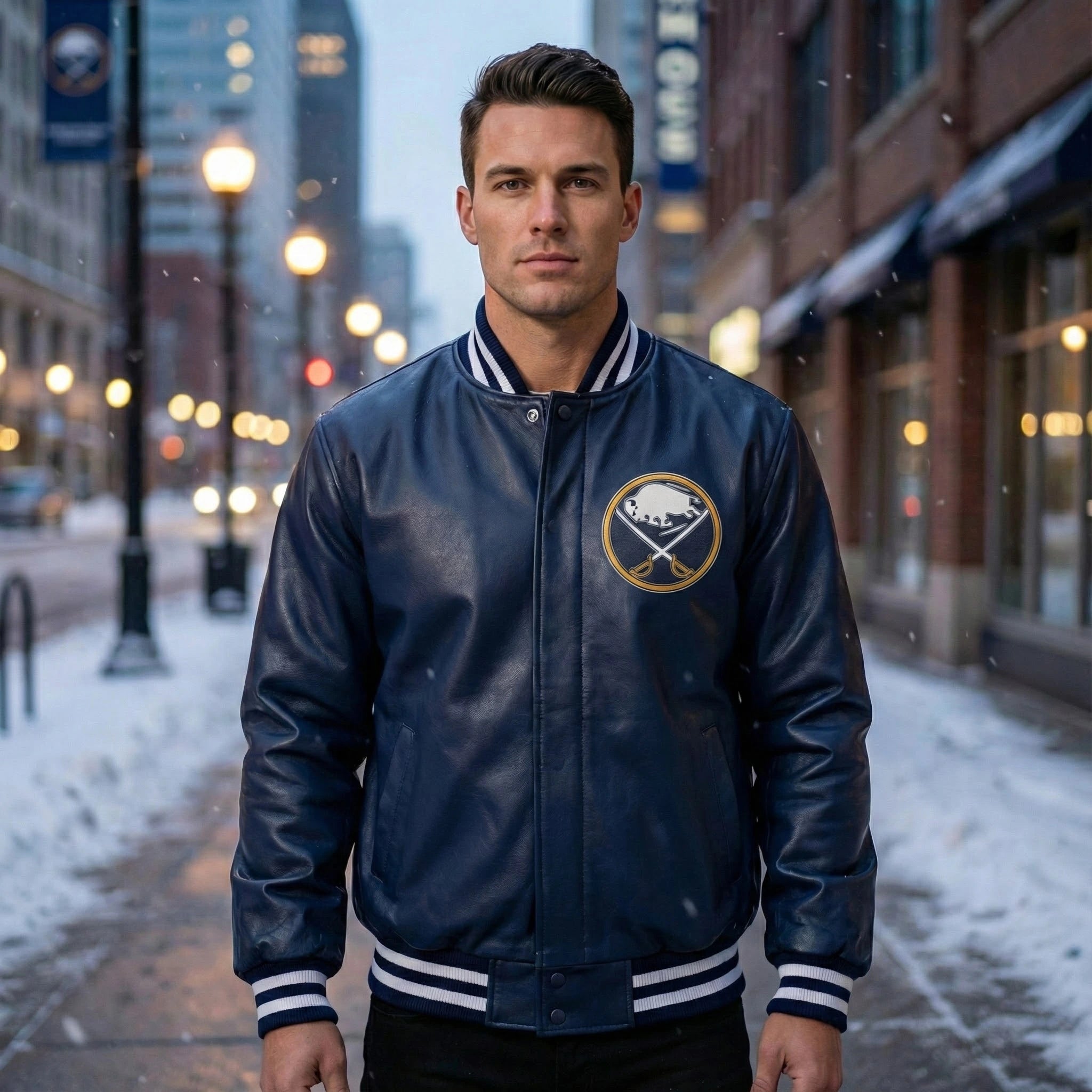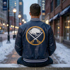 Celebrate your unwavering loyalty to the Buffalo Sabres with this premium navy blue leather jacket. Crafted for true fans who demand both style and authenticity, this NHL varsity jacket combines genuine leather construction with iconic team branding.