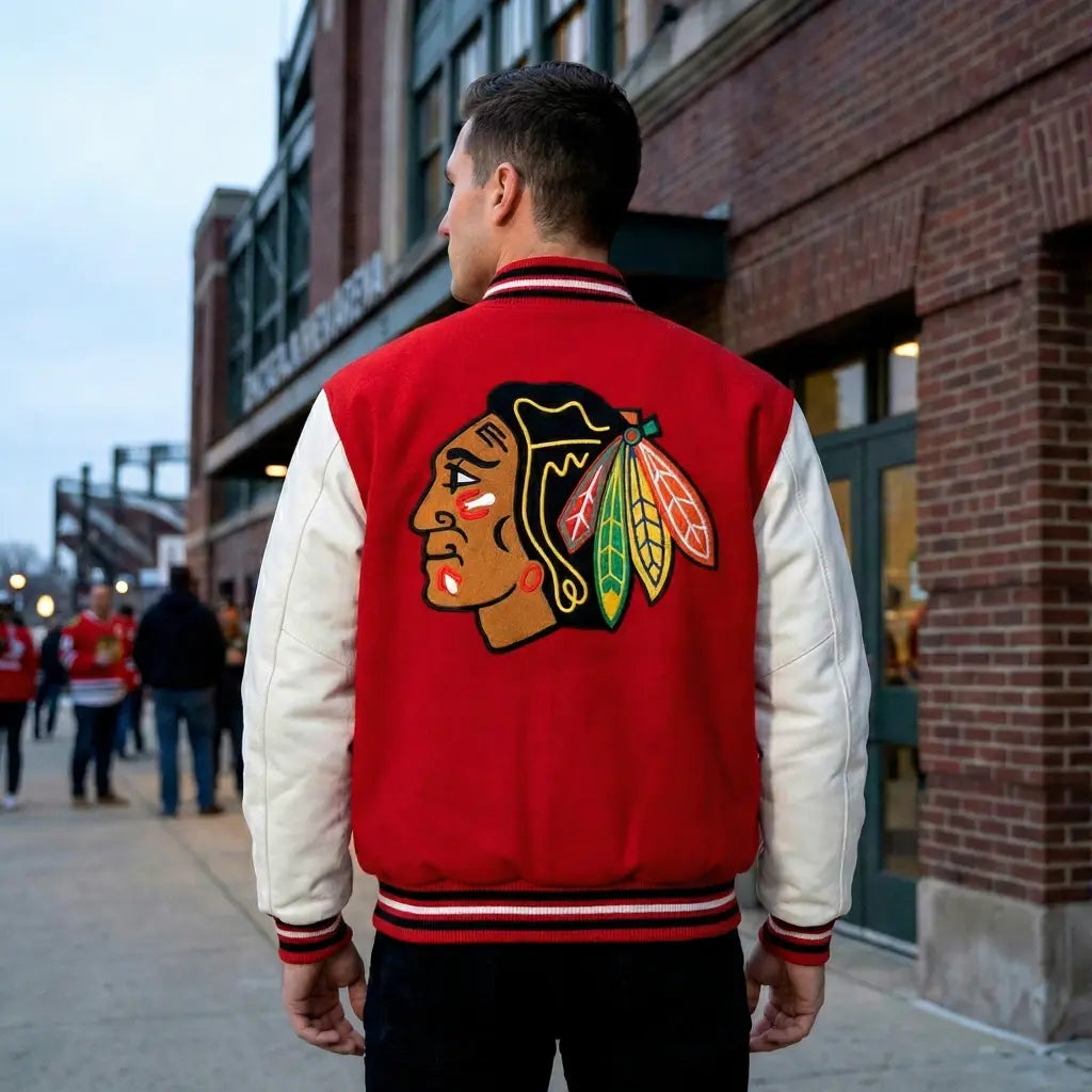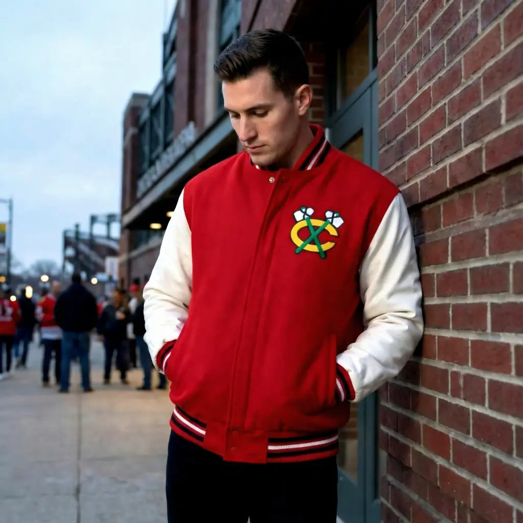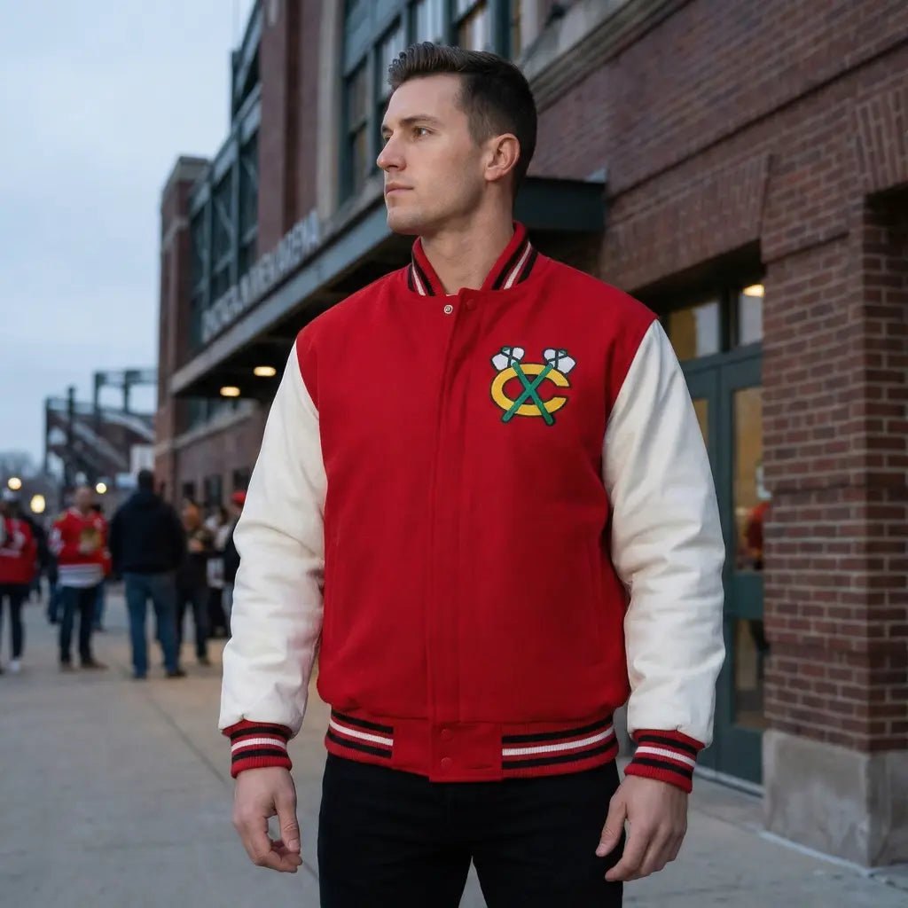 Showcase your Chicago Blackhawks pride with this striking red and white two-tone varsity jacket. Expertly crafted from premium wool with sleek satin sleeves, this NHL-licensed jacket delivers authentic team spirit with classic varsity style that never goes out of fashion.
