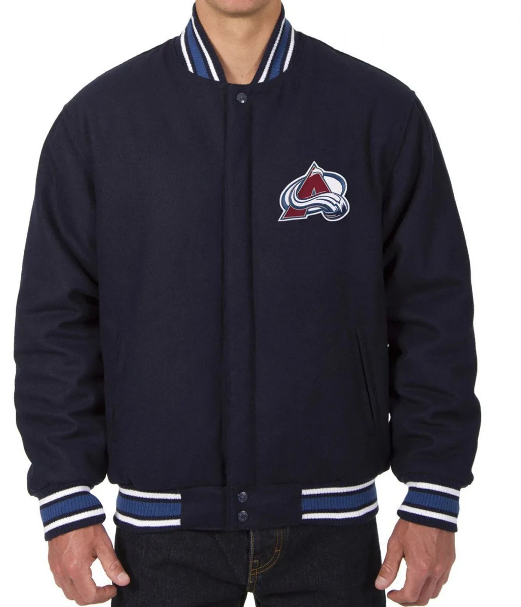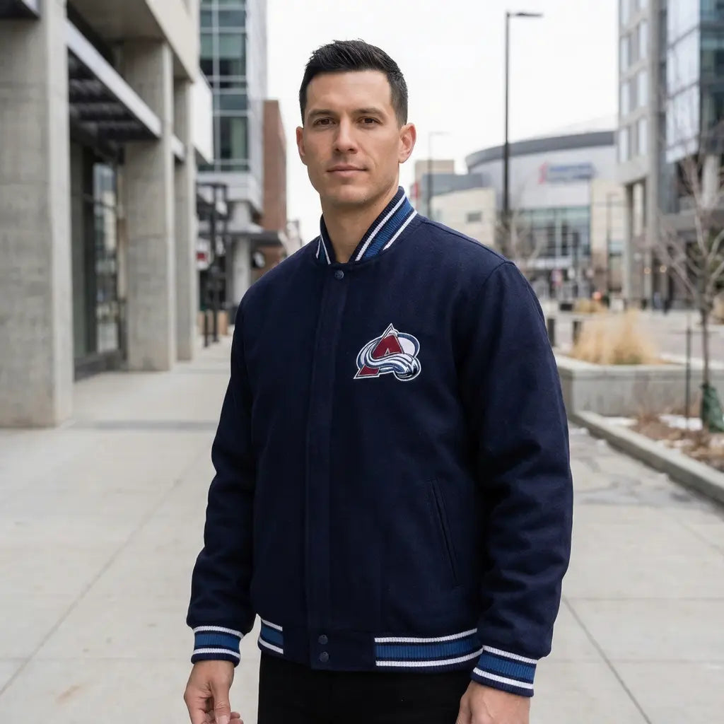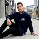 Represent the Colorado Avalanche in premium style with this classic navy blue varsity jacket. Expertly crafted from high-quality wool with sleek satin sleeves, this NHL-licensed jacket combines authentic team pride with timeless varsity aesthetics.