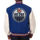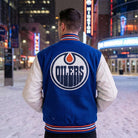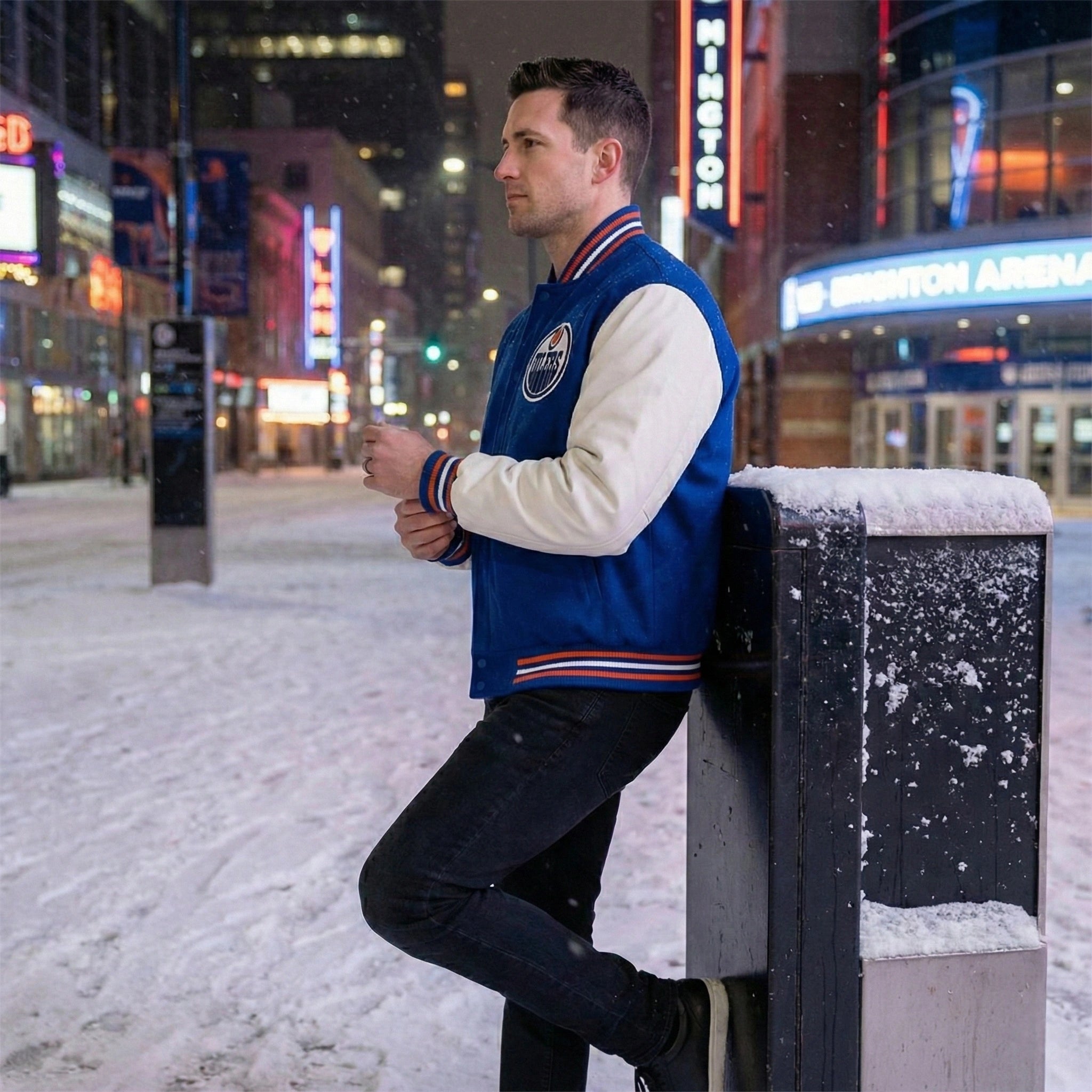 Show your Edmonton Oilers pride in style with this royal blue and white two-tone jacket. Designed for fans who want to represent their team while staying cozy, this jacket features a bold color combination and a soft wool body. The embroidered Oilers logo on the chest gives it an authentic touch, perfect for game days or casual wear. Whether you’re cheering at the rink or out on the town, this jacket is the perfect blend of comfort and team spirit.