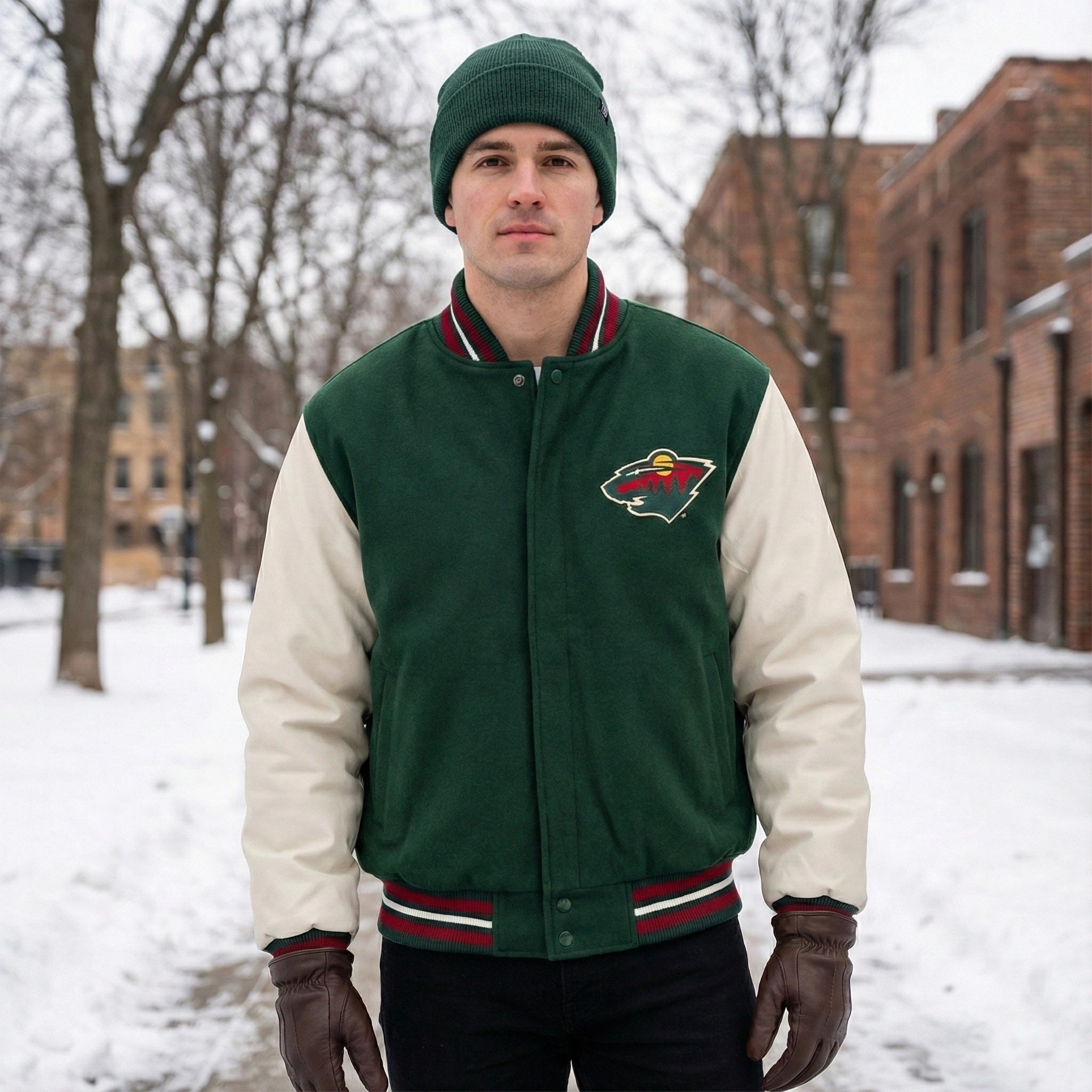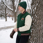 Support your Minnesota Wild in style with this green and white varsity jacket. Crafted with a warm wool body and genuine leather sleeves, this jacket offers both comfort and durability. The vibrant team colors and embroidered Minnesota Wild logo make it an ideal choice for showing off your team pride. Whether you're attending a game or heading out for casual wear, this jacket ensures you stay warm and look sharp.