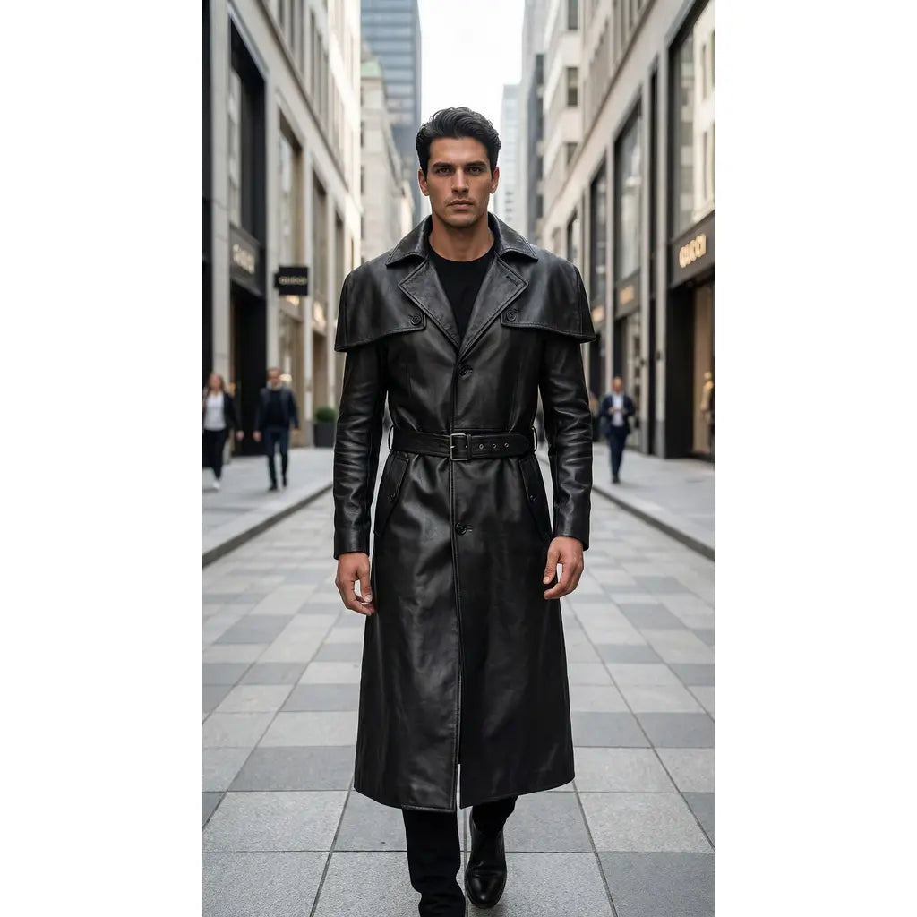 Experience the perfect blend of heritage craftsmanship and contemporary design with this iconic leather duster trench coat.