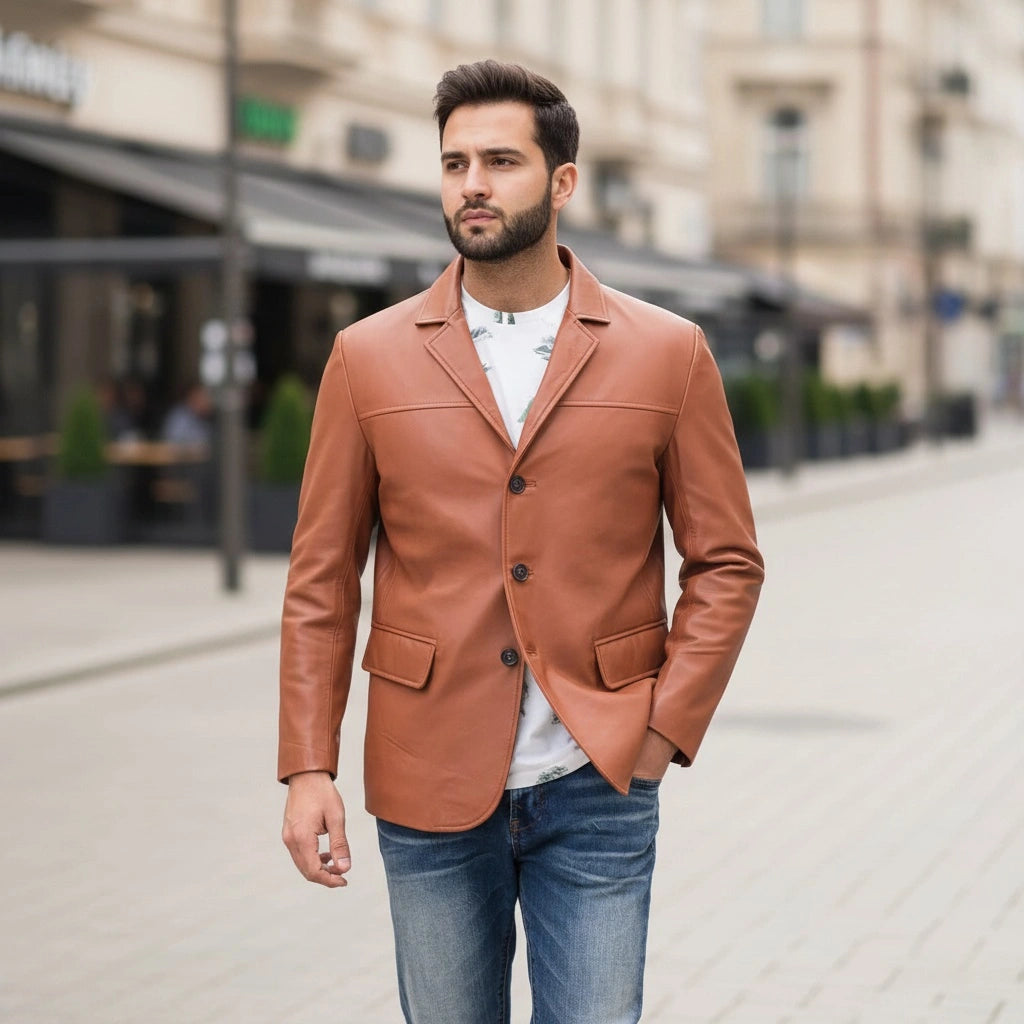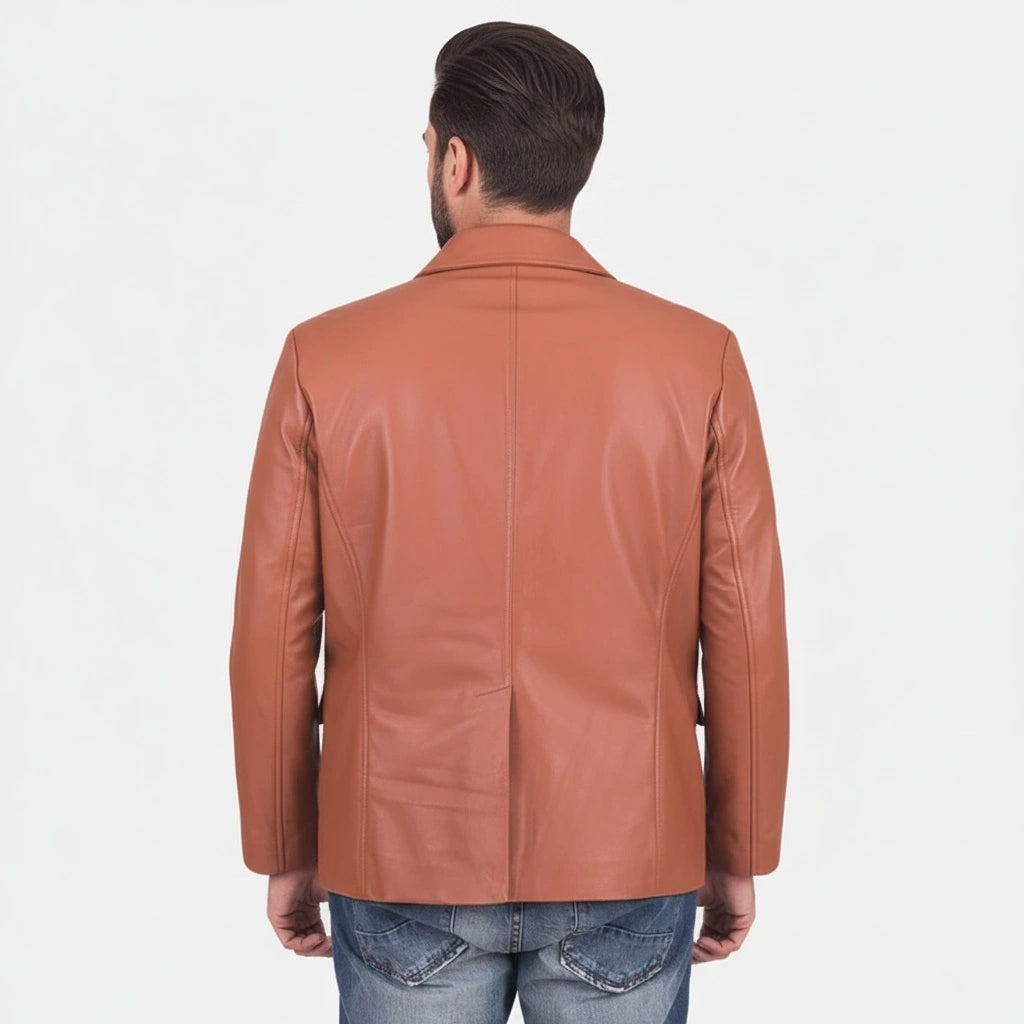 The Men James Tan Brown Leather Blazer is for those who seek a sophisticated, stylish, and timeless piece that stands out with its unique color and high-quality craftsmanship. Ideal for various occasions, this blazer will effortlessly enhance your style, making it a wardrobe essential for any fashion-conscious man. Add the Men James Tan Brown Leather Blazer to your collection for an elevated, confident look