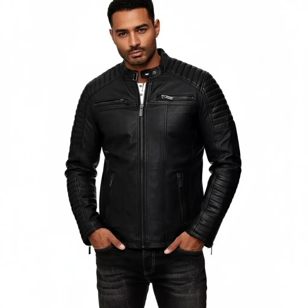 This Men's Black Leather Jacket in cafe racer style features premium soft sheepskin leather for ultimate comfort and durability. Designed for motorcycle enthusiasts, it blends classic biker aesthetics with modern functionality, making it perfect for both riding and everyday wear.