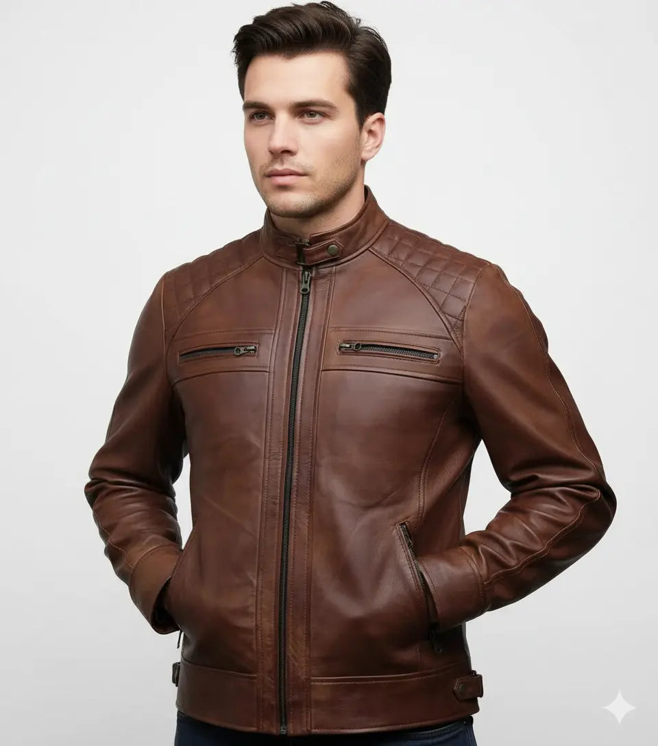 This Men’s Leather Jacket in black and brown features genuine sheepskin leather, offering both durability and comfort. The café racer style delivers a sleek, edgy look, perfect for motorcycle riders or those looking to make a bold statement in fashion.