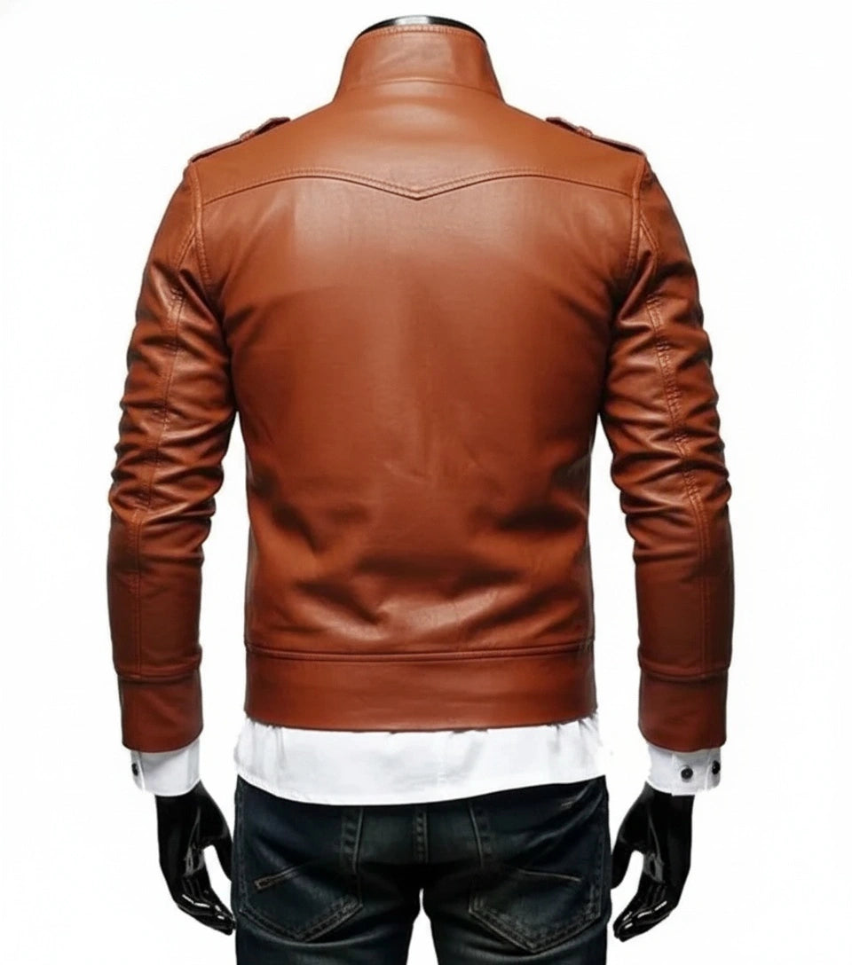 The Men’s Slim Fit Tan Button Front Brown Leather Jacket combines classic elegance with a contemporary design. Crafted from premium brown leather, this jacket features a button front closure and a slim fit cut, making it perfect for stylish casual wear or a smart look for any occasion.
