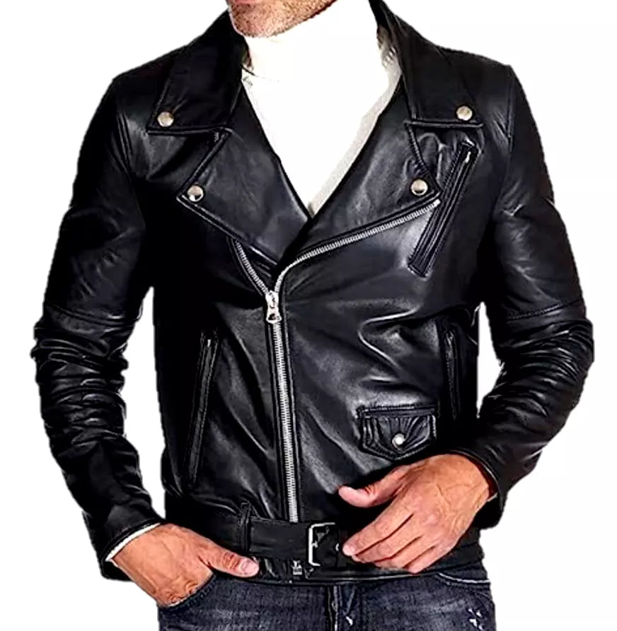 Men's Leather Jacket Coat Sheepskin Black Brando Biker Style Motorcycle