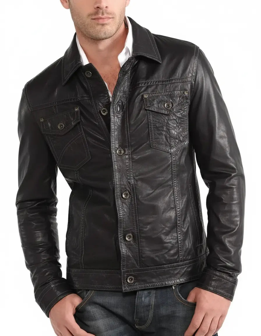 Men’s Black Cowhide Leather Luxury Vintage Trucker Motorcycle Biker Jacket