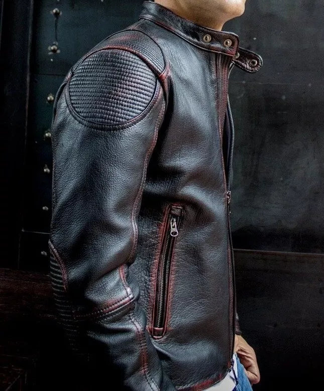 Men's Leather Jacket Cafe-Racer Retro Motorcycle Biker Black Real Leather