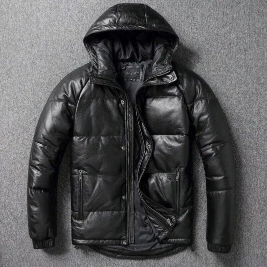 The Men’s Down Puffer Leather Jacket Casual Bomber Real Leather Puffy Fashion Coat is the...