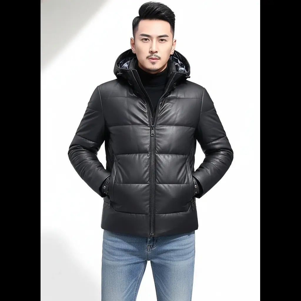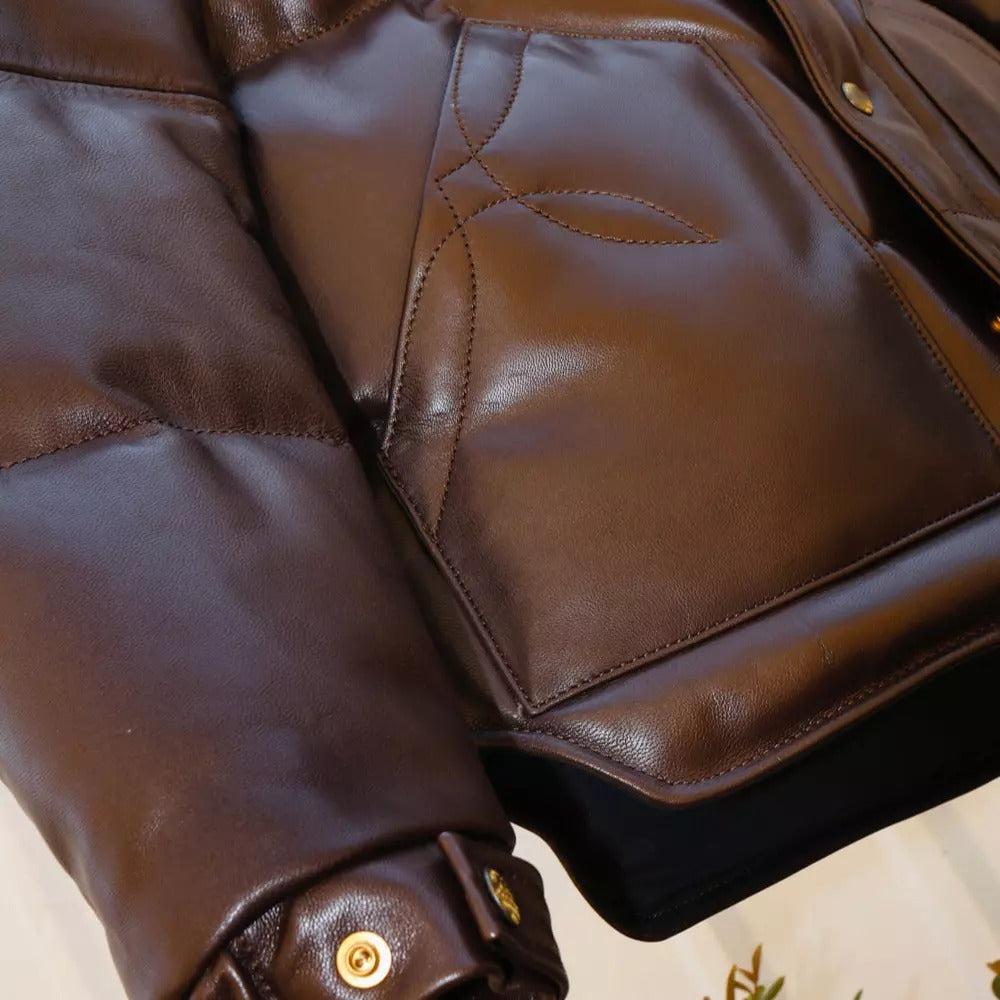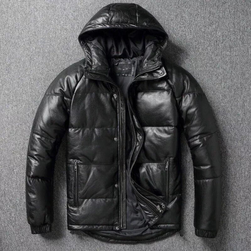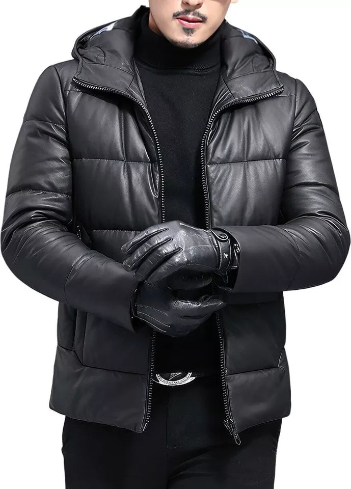 Mens Down Puffer Leather Jacket Casual Bomber Real Leather Puffy Fashion Coat