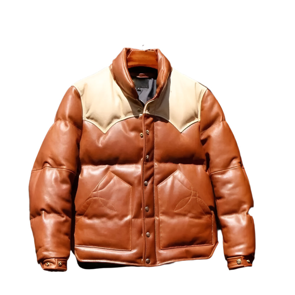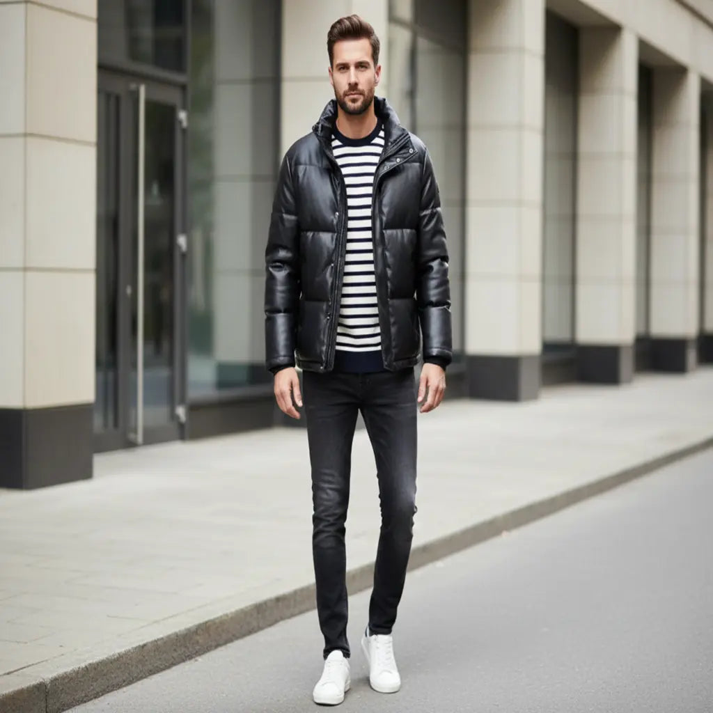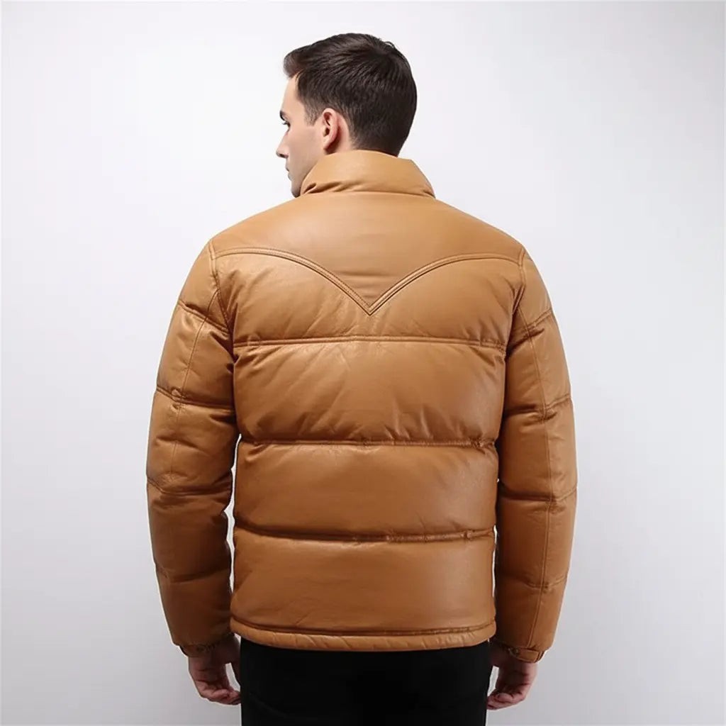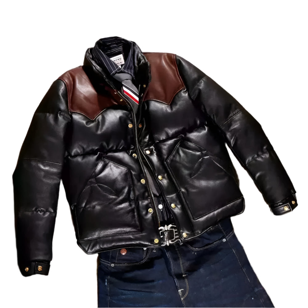 Mens Down Puffer Leather Jacket Casual Bomber Real Leather Puffy Fashion Coat