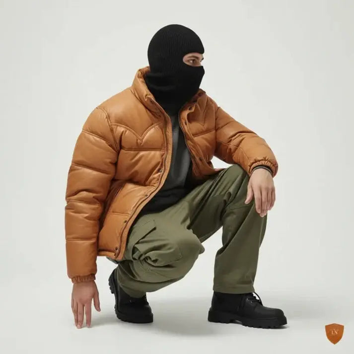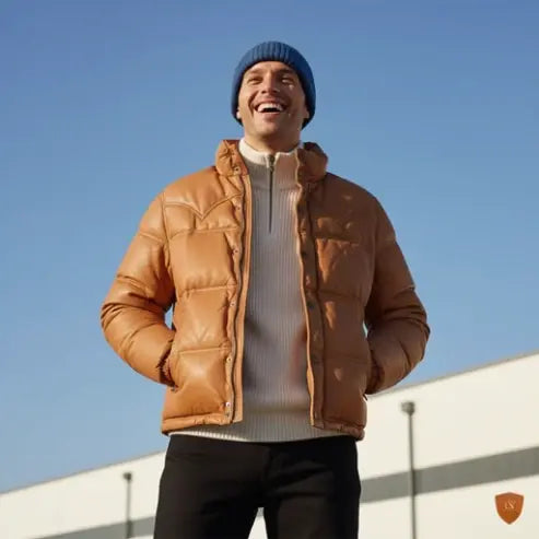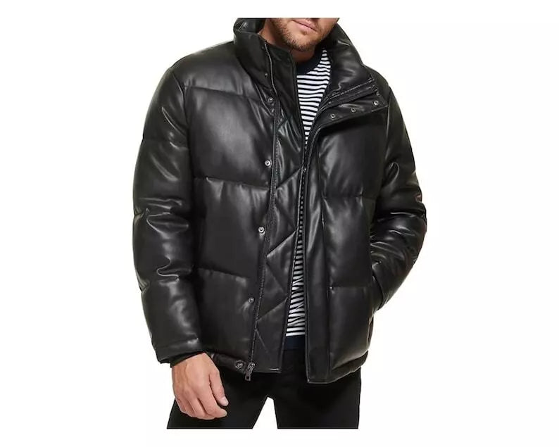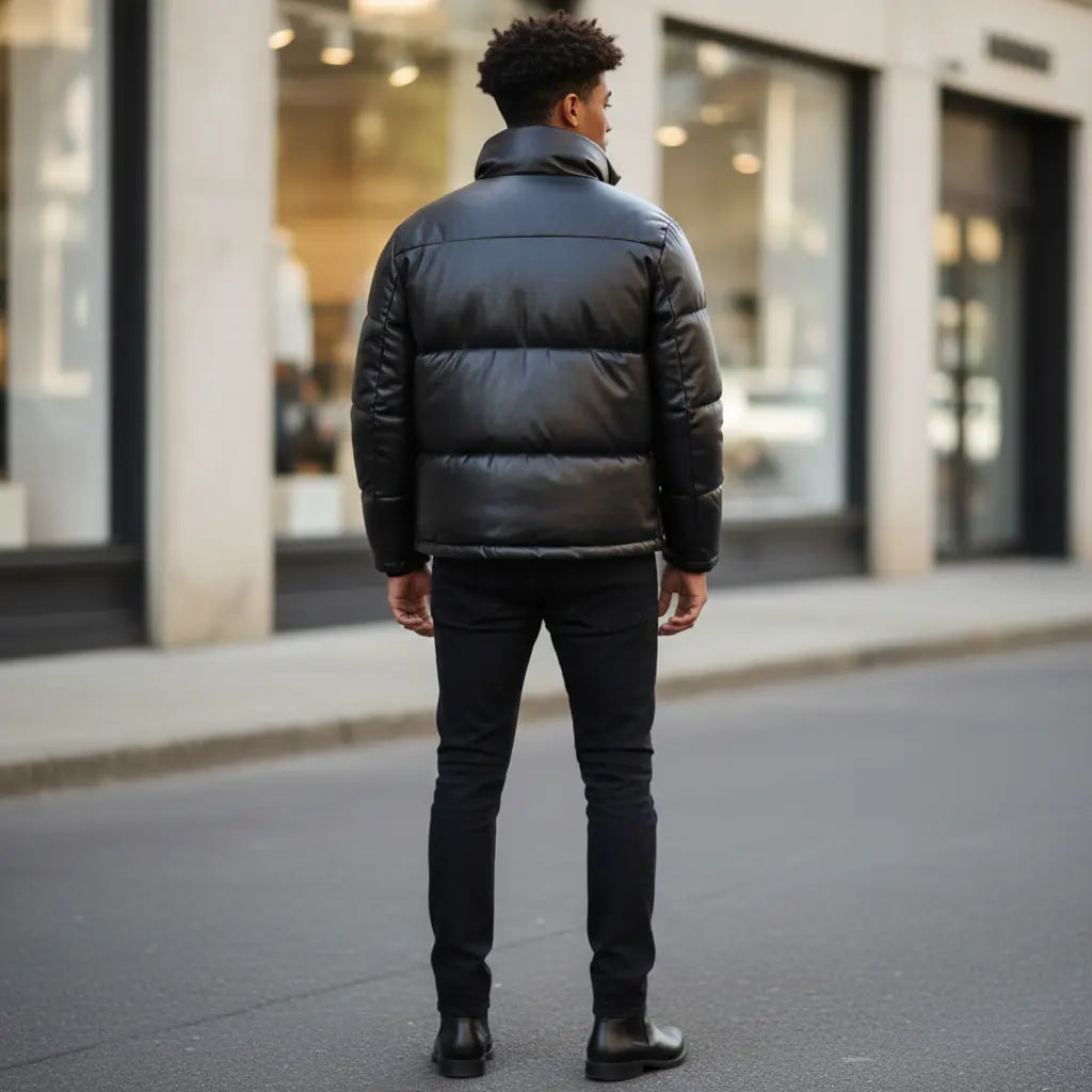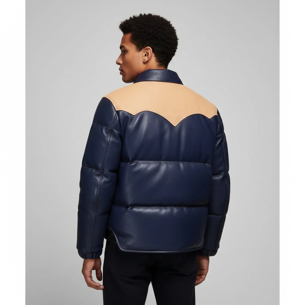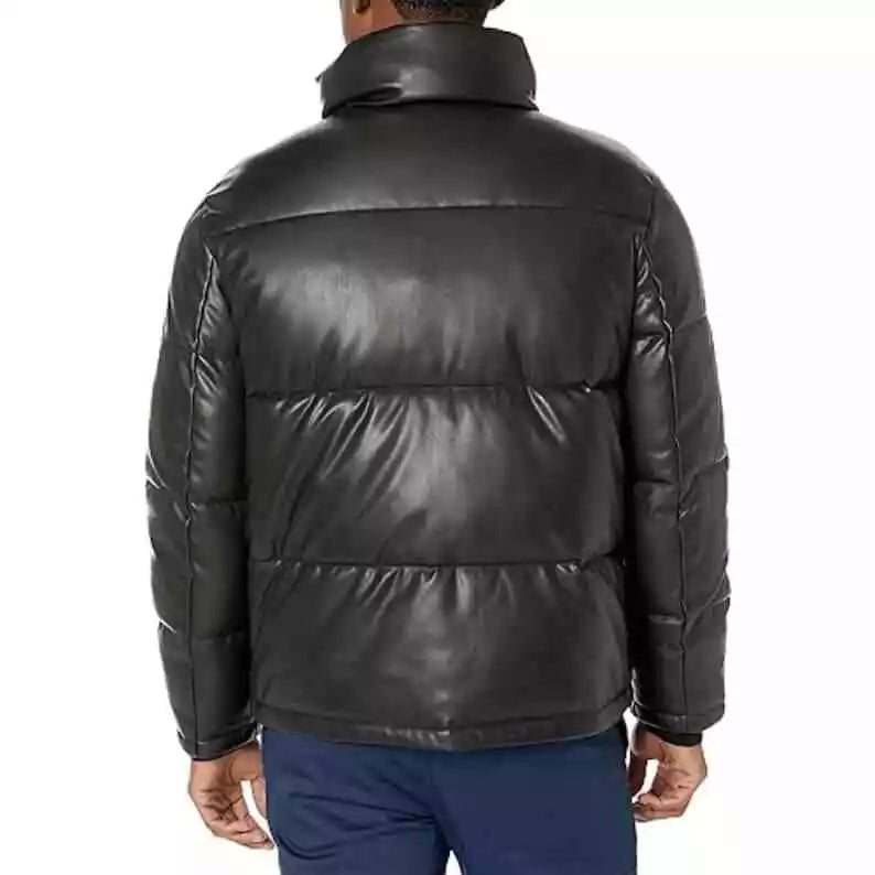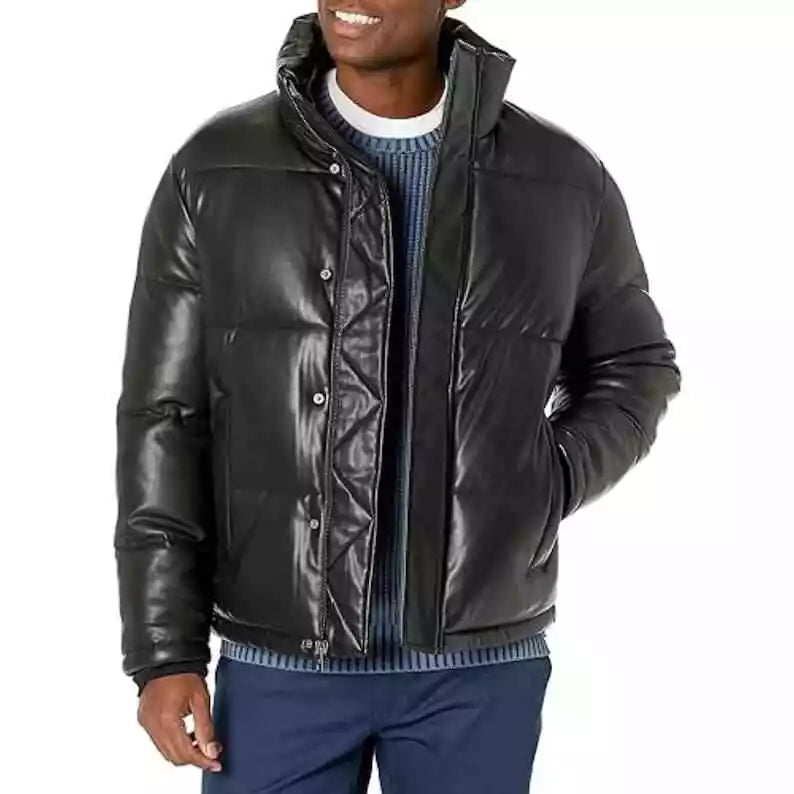 Men Quilted Bomber Puffer Jacket Handmade Genuine Leather Puffer Coat