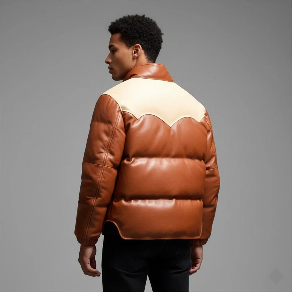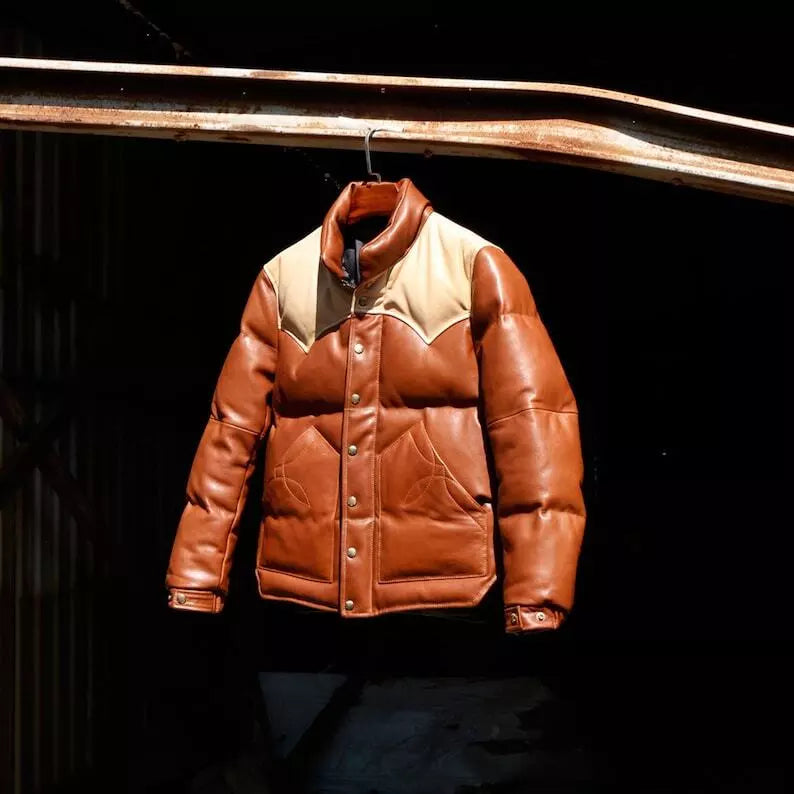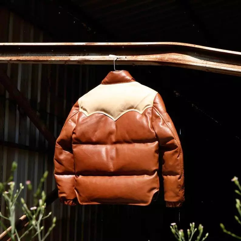 Men 70s Puffer Brown Leather Jacket Vintage Leather Jacket Handmade Coat